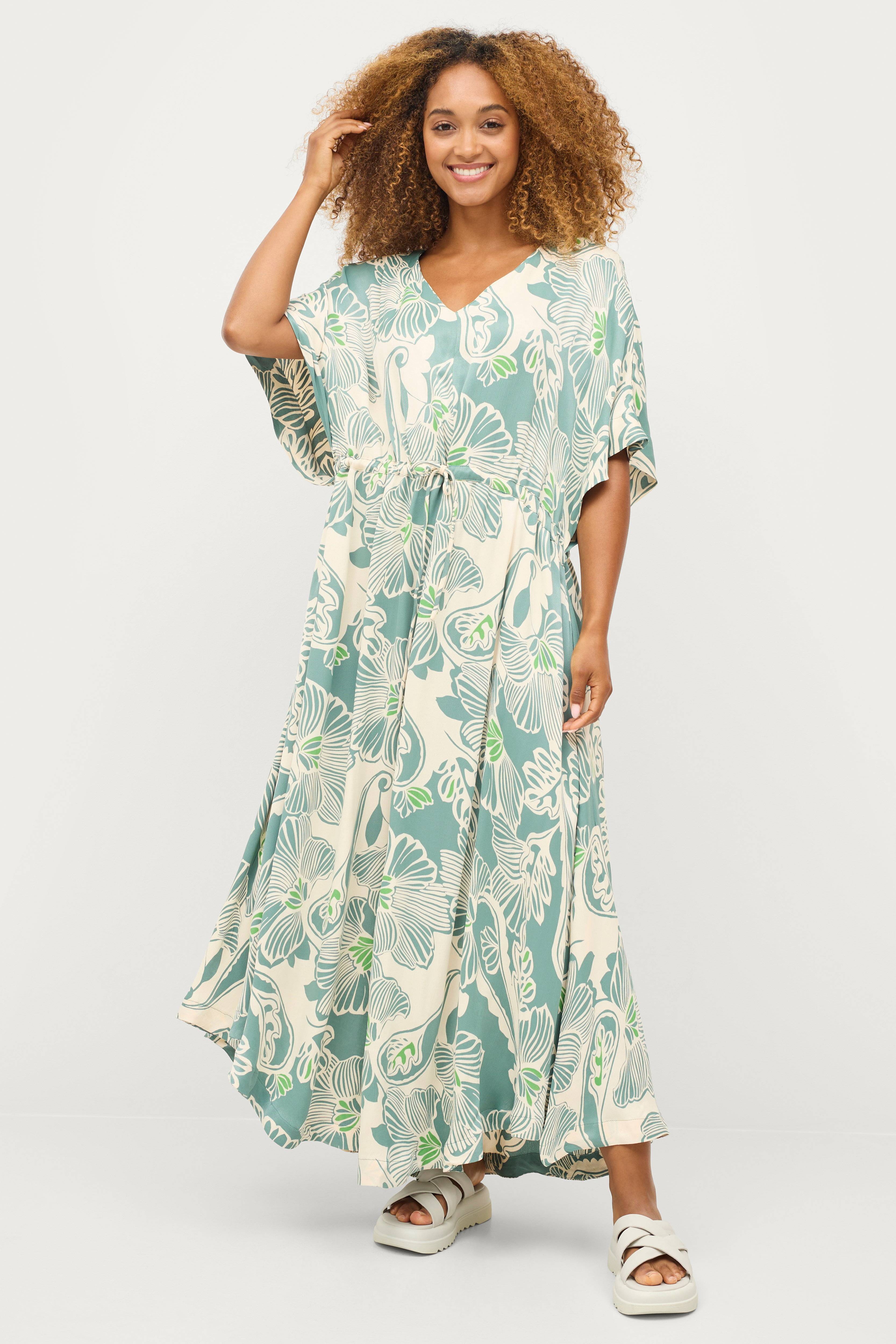 • Lang, mønstret kjole i viskose• V-udskæring• Korte, brede kimonoærmer• Træksnørre ved taljen• Længde: 137 cm i størrelse S
