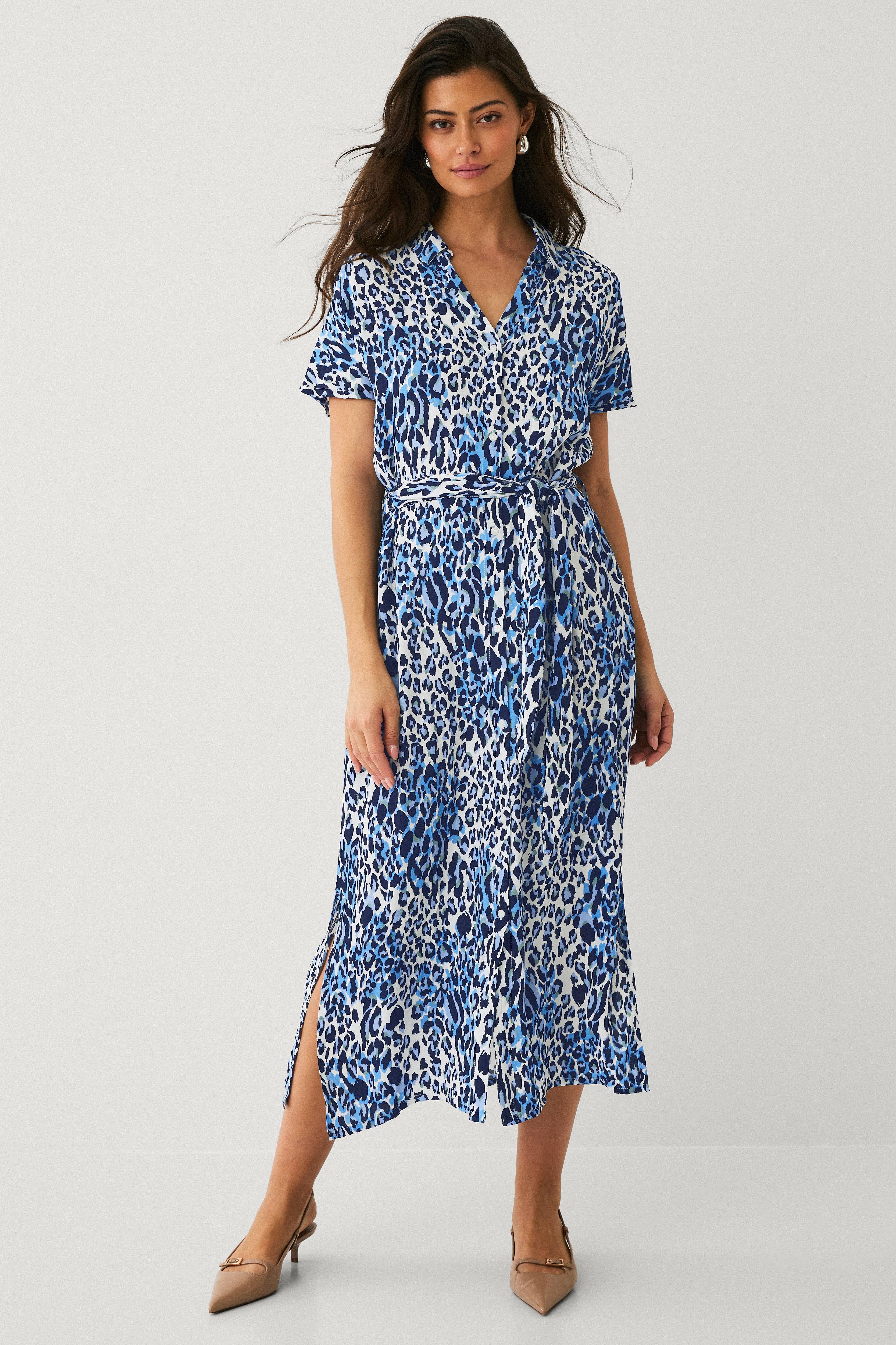 Maxikjole BlancaSZ SS Dress Calf Length i let, vævet viskoskvalitet med printet mønster. Kort ærme. Gennemknappet, lige model med krave og V-formet halsudskæring. Aftageligt bindebælte i taljen. Længde ca. 134 cm i str. S.