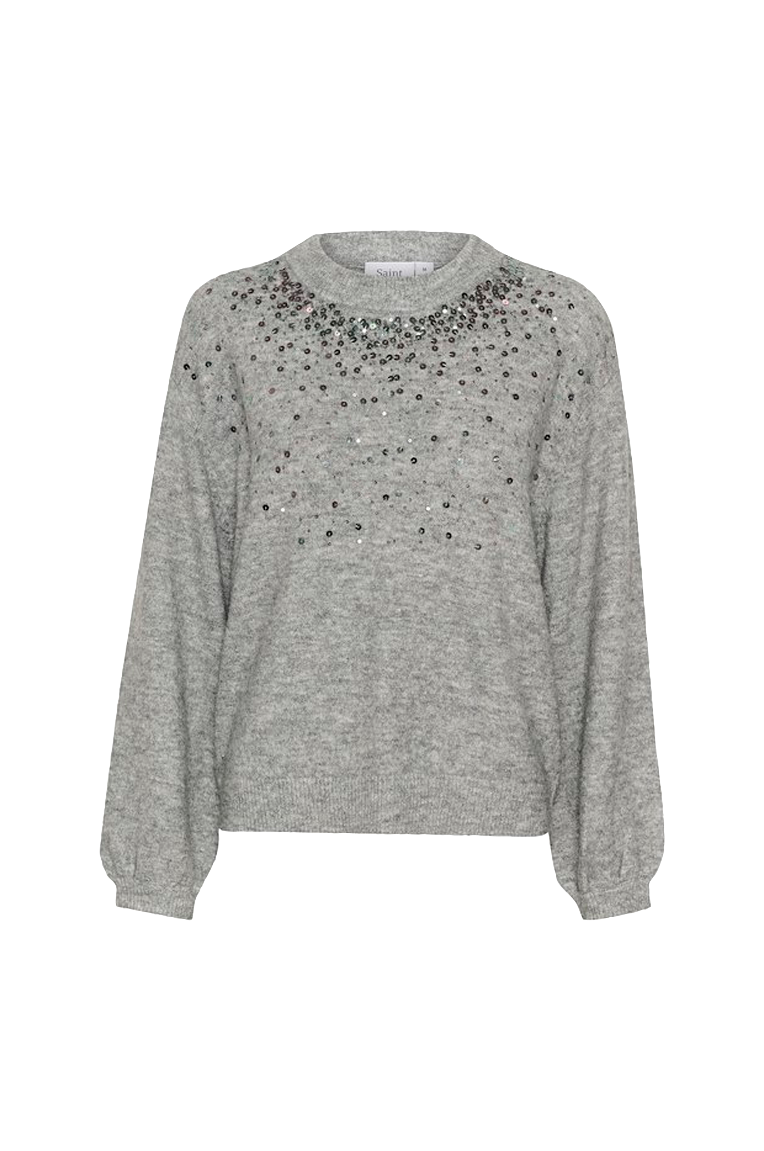 • Blød, strikket trøje i uldblanding• Skinnende pailletter oppe foran• Rund, ribbet halsudskæring• Brede ærmer• Ribstrik ved manchetterne og nederst