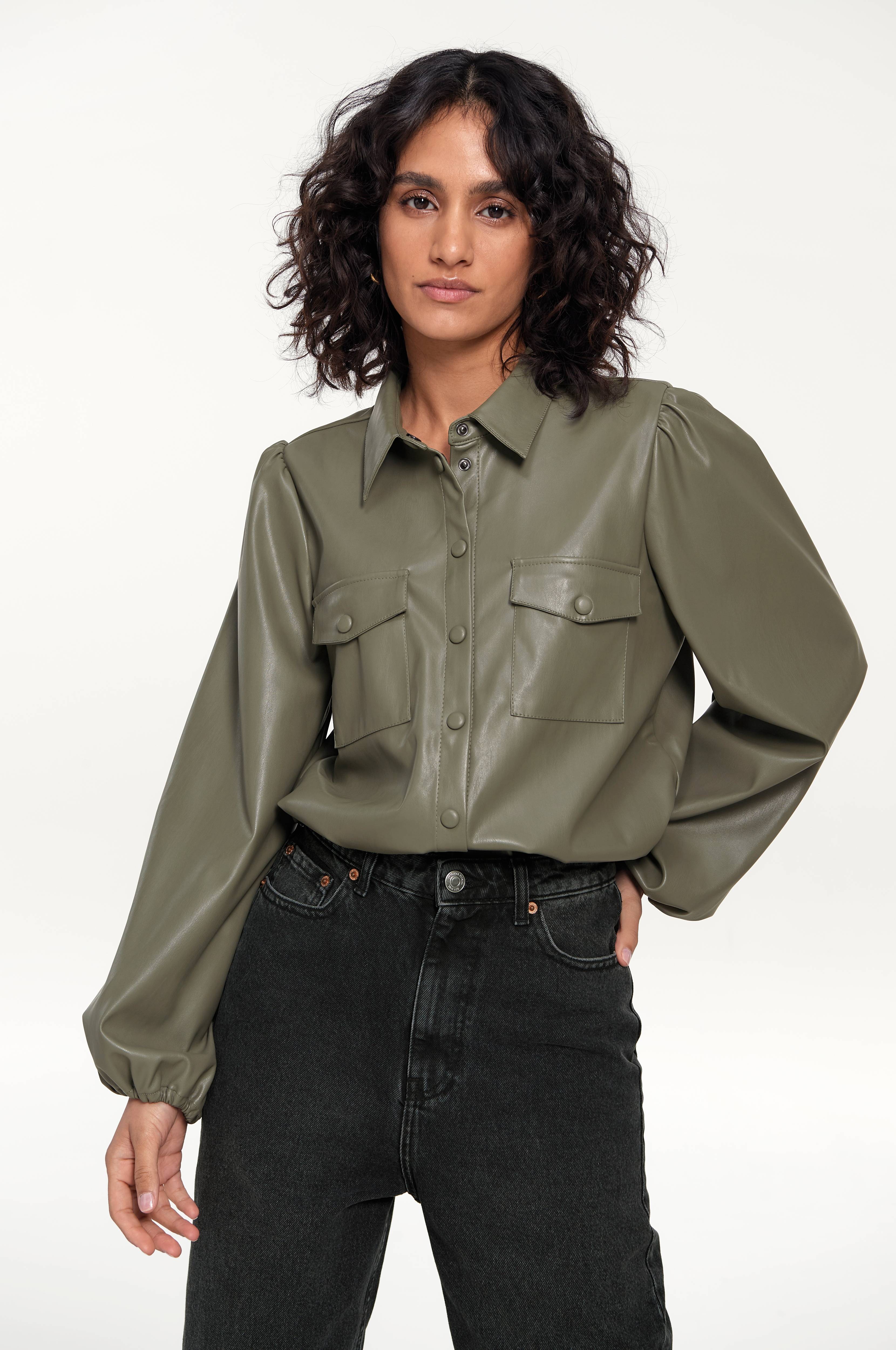 Skjorte i imiteret skind med stretch. Betrukne trykknapper foran, brystlommer med klap og knap og lange ballonærmer med elastisk ærmekant. Ikke sømmet i kanten forneden.