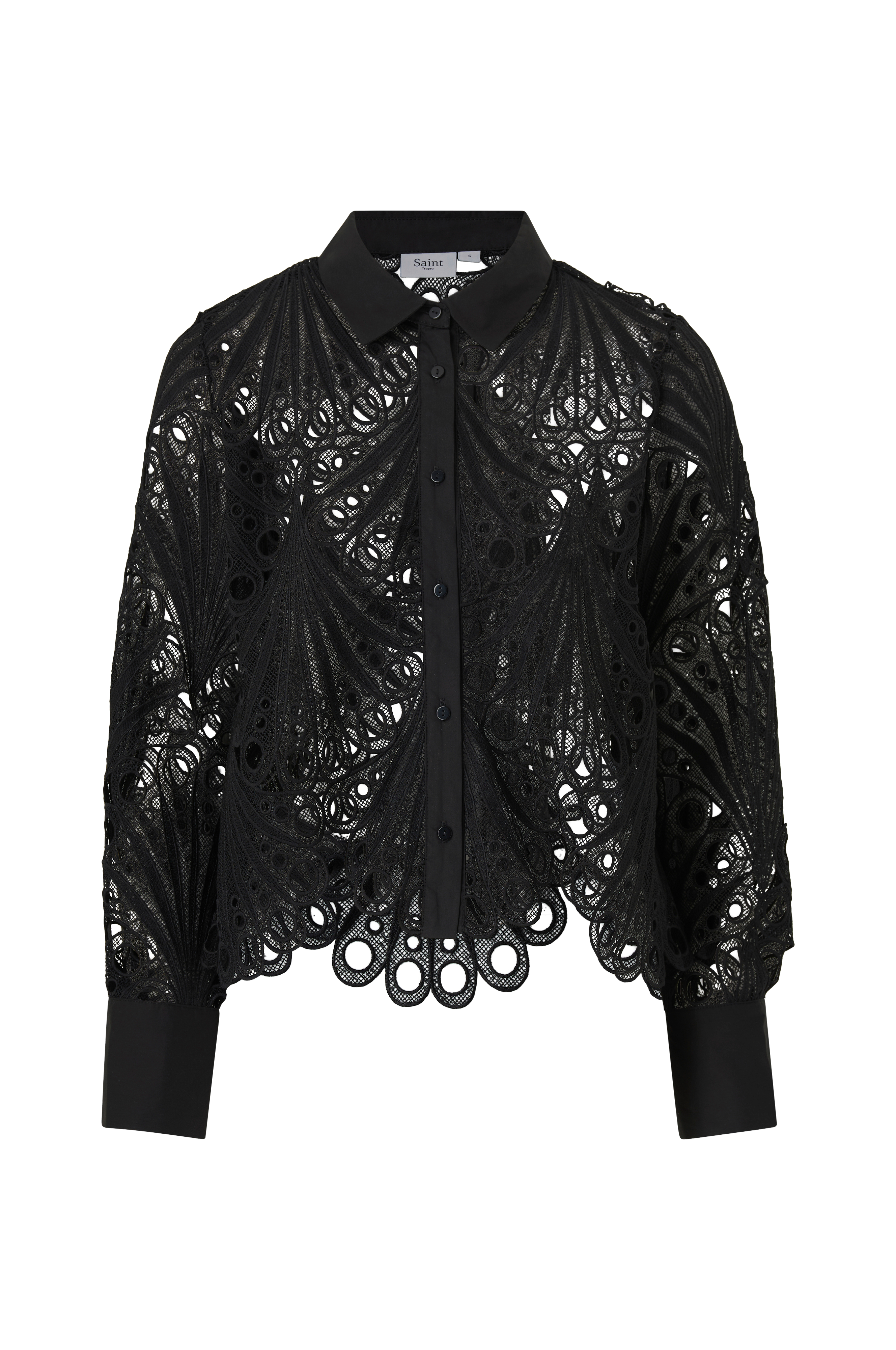 • Skjorte i transparent, hulbroderet polyester med blomstermotiv