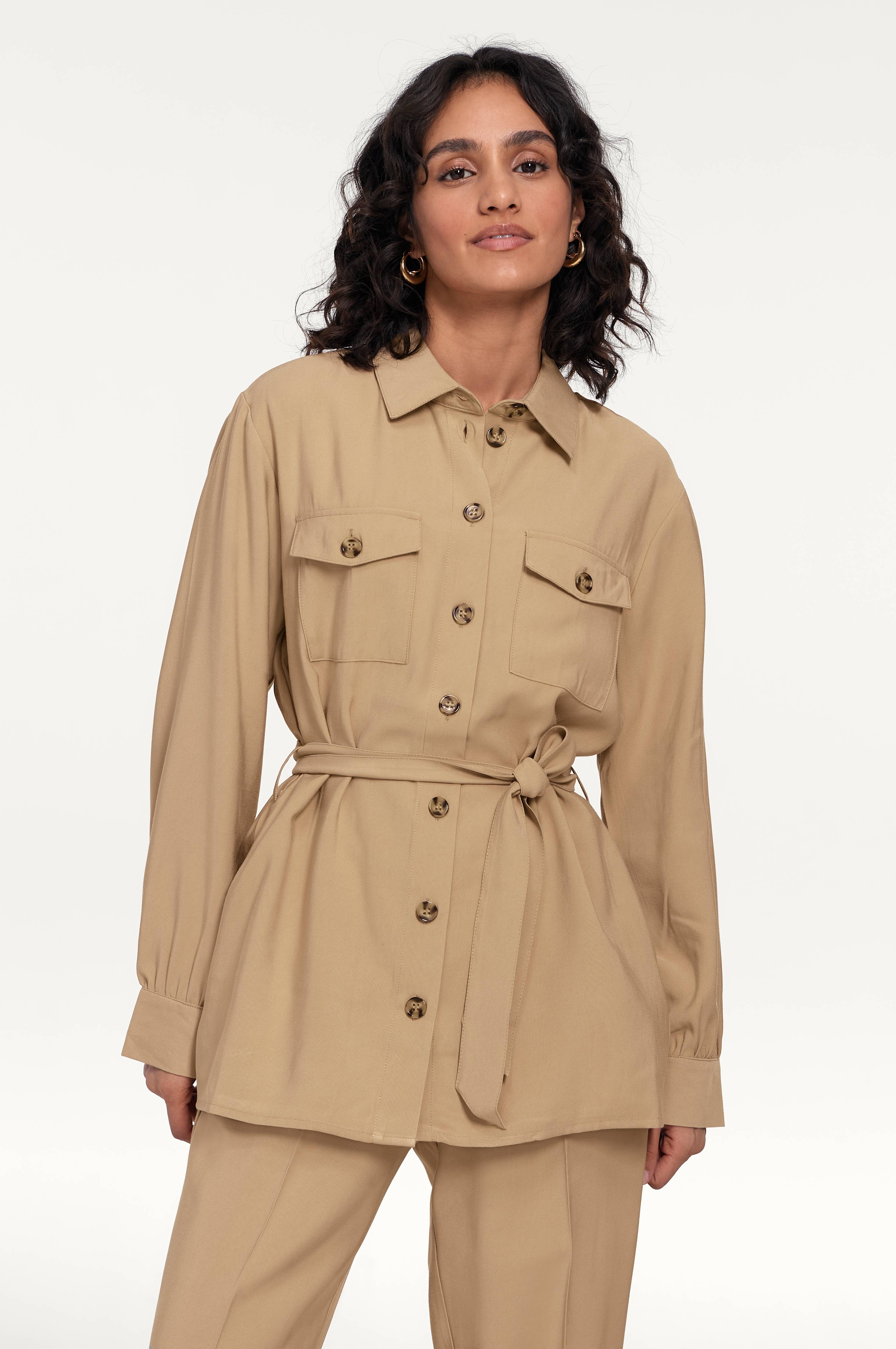 Skjorte i kraftig, vævet kvalitet. Knapper foran, lommer i siderne, brystlommer med klap og bindebælte i taljen. Lange ærmer med manchet og knap i ærmekant.