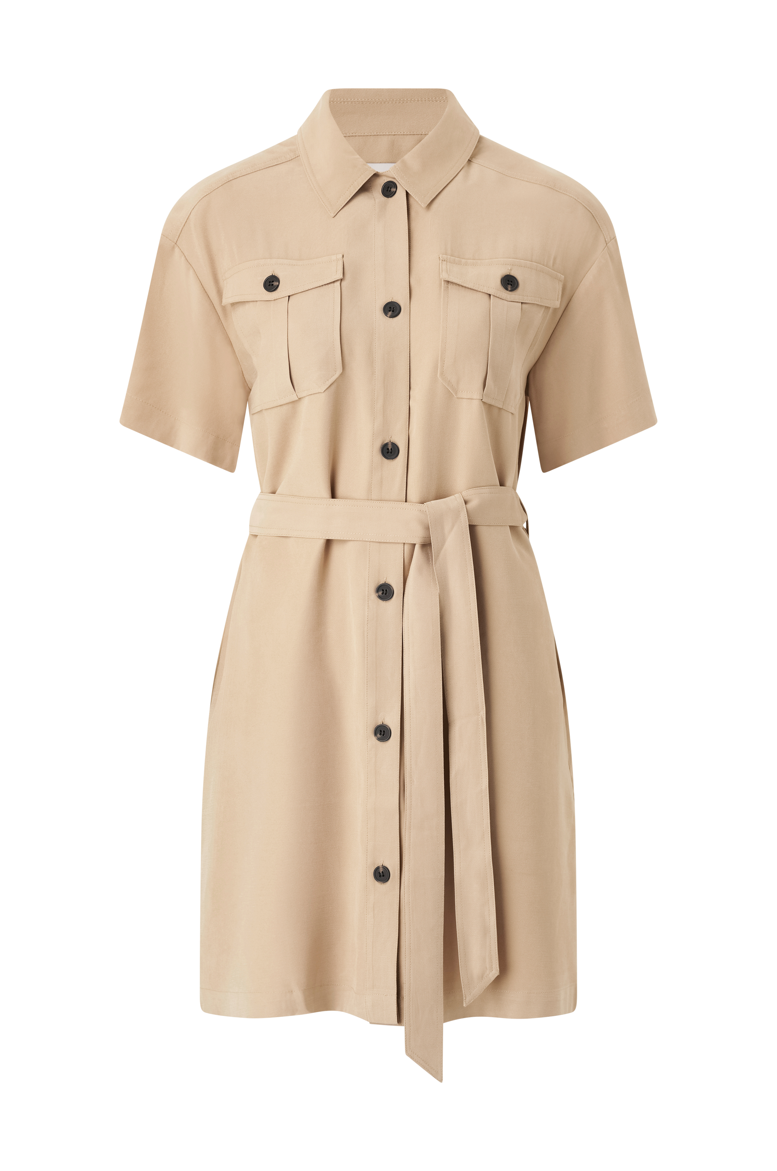 • Skjortekjole med aftageligt bælte ved taljen• Brystlommer med låg og knapper• Korte, opfoldende ærmer med knaplukning• Længde: 95 cm i størrelse S
