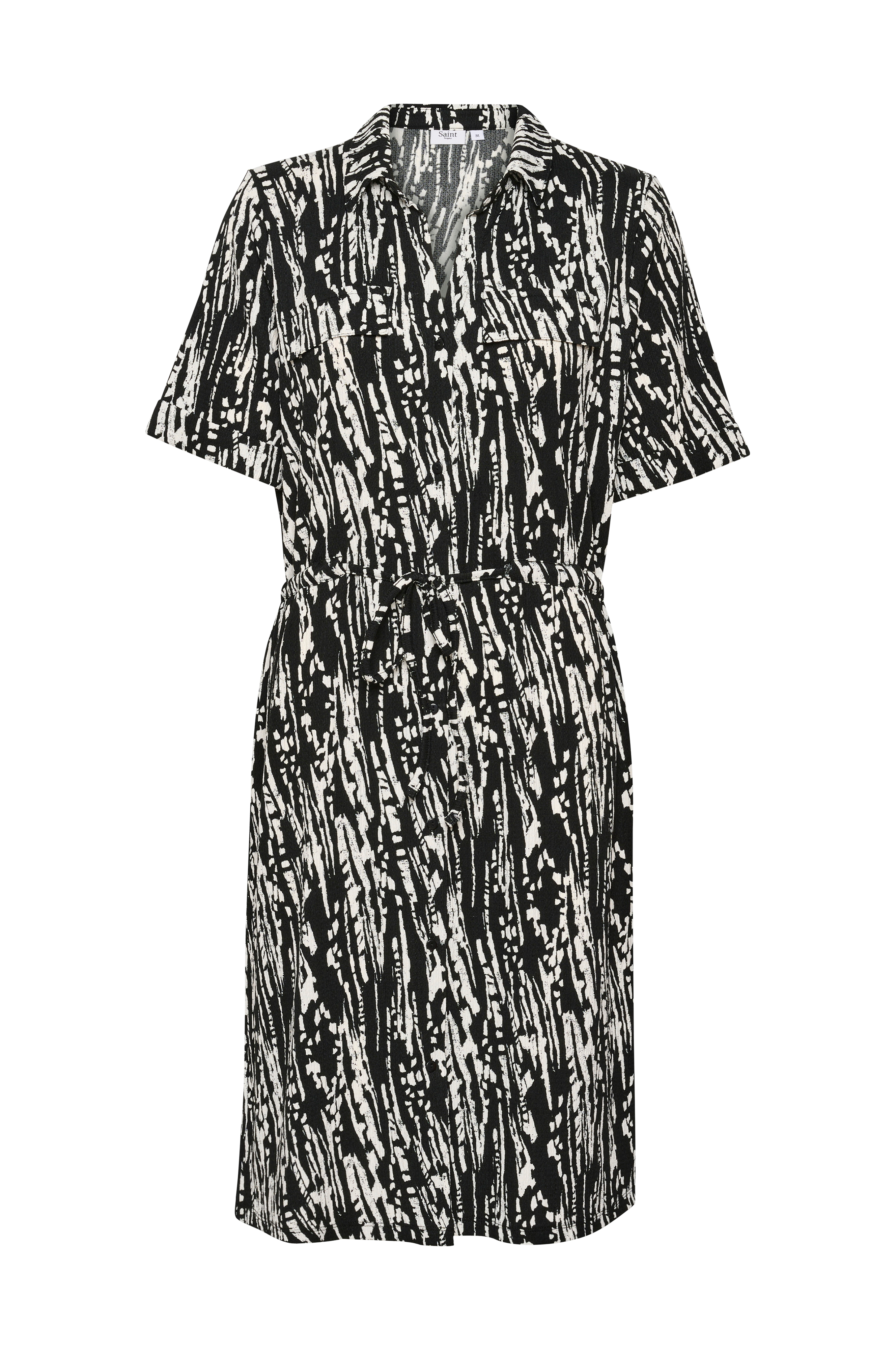 • Let udsvingende model i crepe• Træksnørre med bindbart bånd ved taljen• Knapstolpe hele vejen frem• Kort ærme med oprullet• Længde: 106 cm i størrelse S