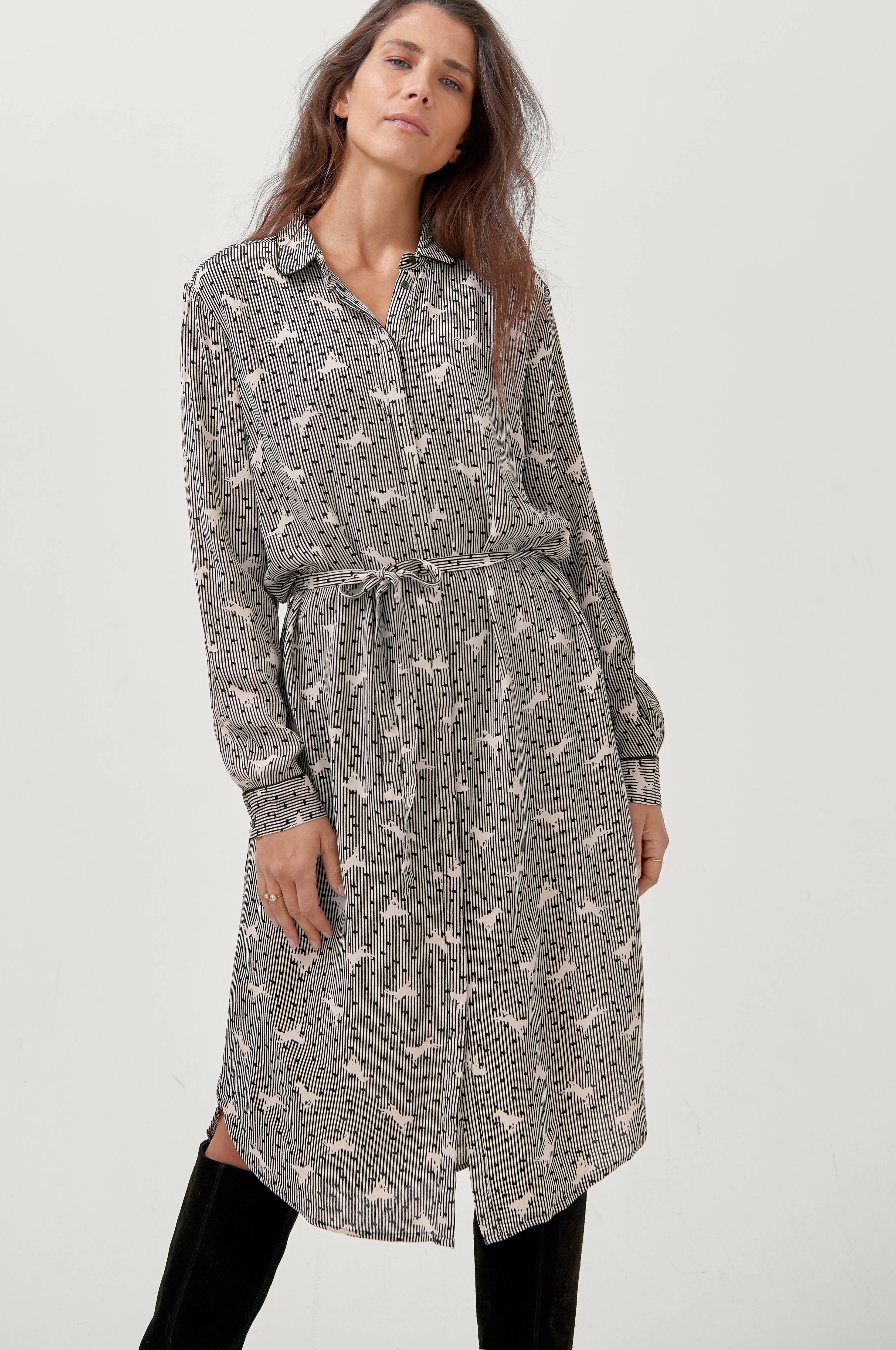 Skjortekjole Woven Shirt Dress fra Saint Tropez. Lige model med lille skjortekrave som har smal paspoleret kant samt lukning med skjulte knapper hele vejen foran. Små stropper med bindebælte i taljen og manchet med paspoleret kant i ærmekant. Længde ca. 115 cm i str. S.