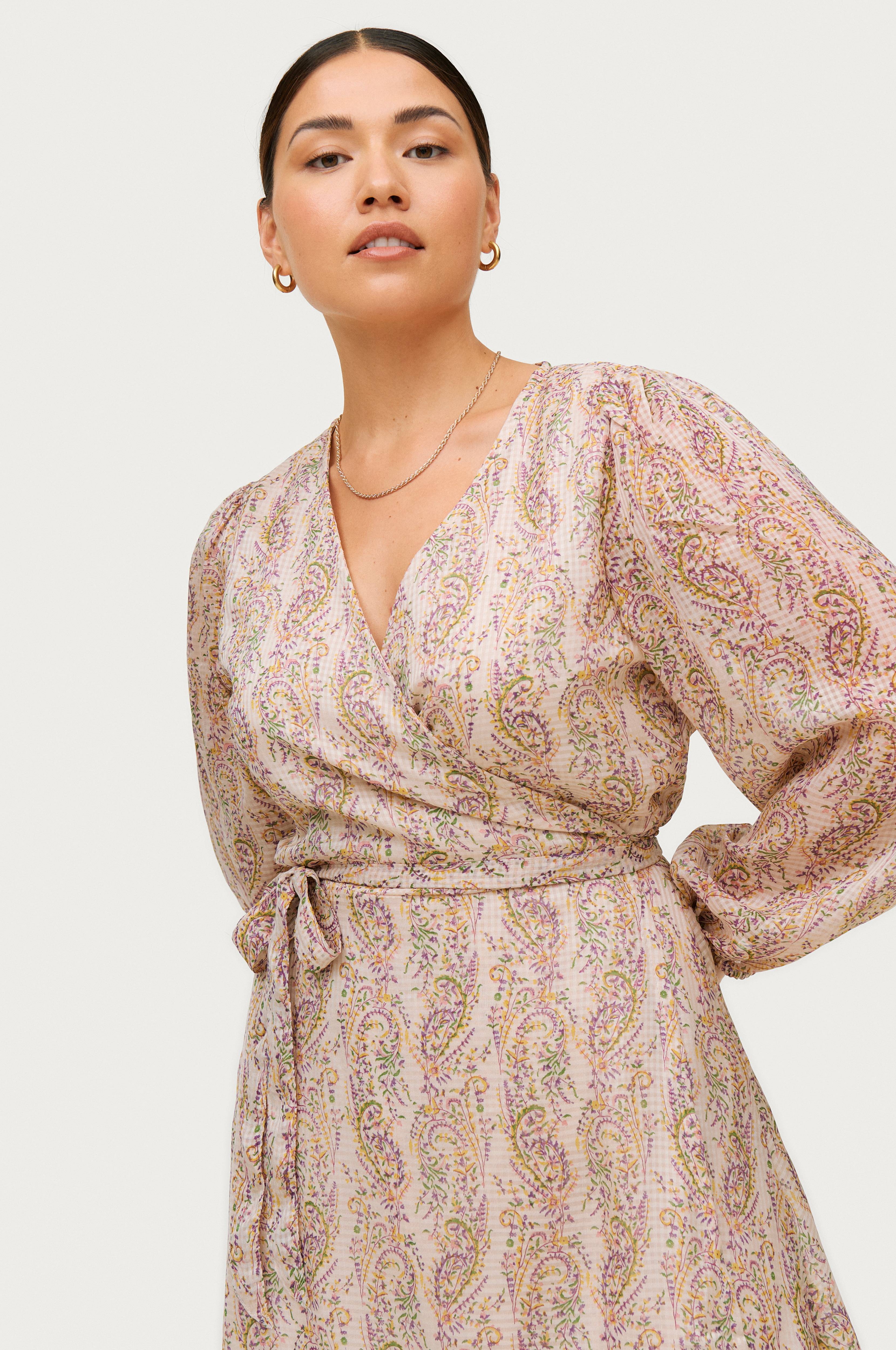 • Slå-om design med bindebånd ved taljen• Lange ballonærmer med elastiske manchetter• Tynd, vævet kvalitet• Trikotfor• Længde: 102 cm i størrelse S