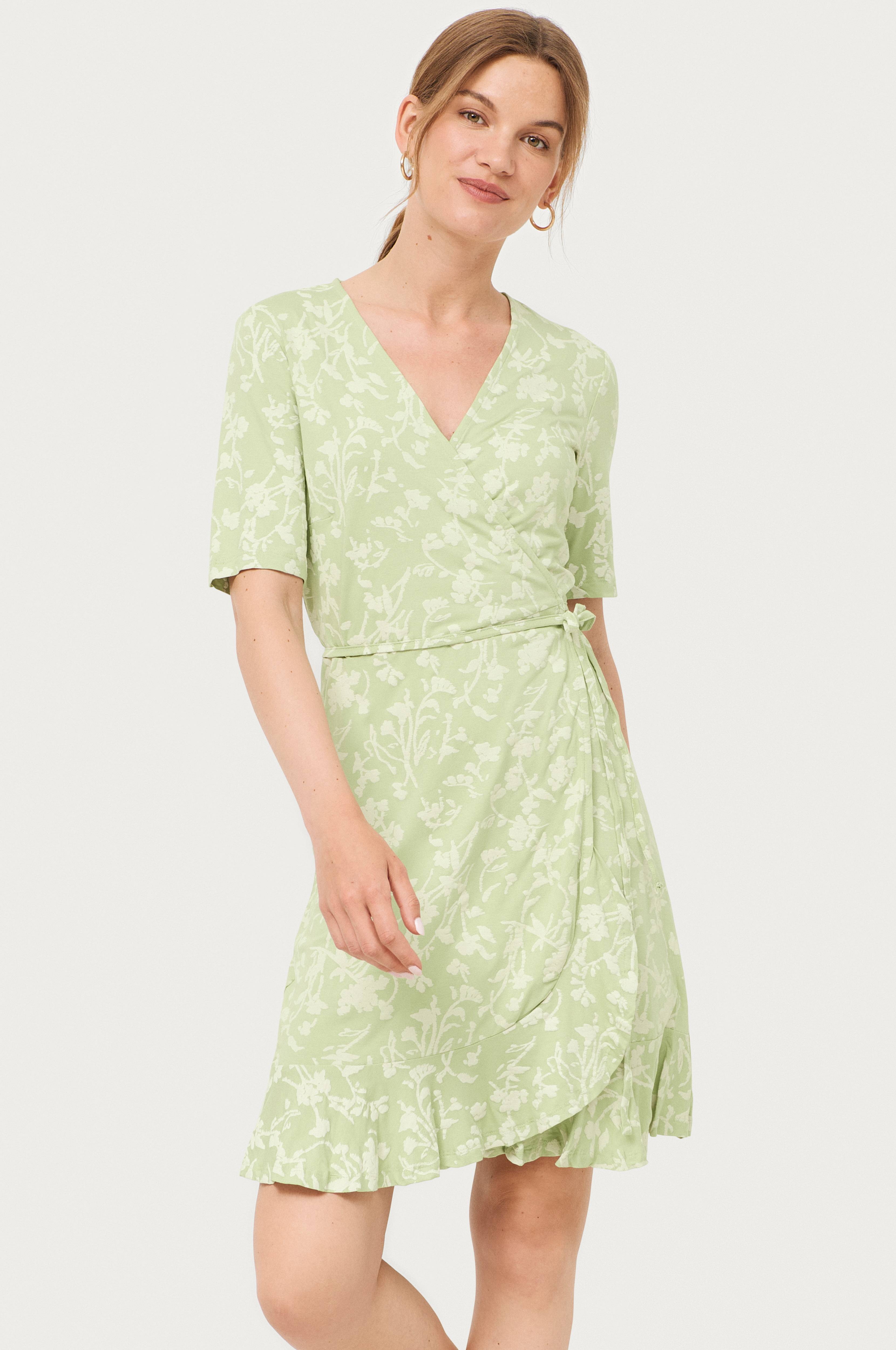 Slå om-kjole MinaSZ Wrap Dress fra Saint Tropez med elastisk talje med bindebånd i siden. Nederdel med fint fald og flæse. Fremstillet i prikket jersey. Længde ca. 100 cm i str. S.