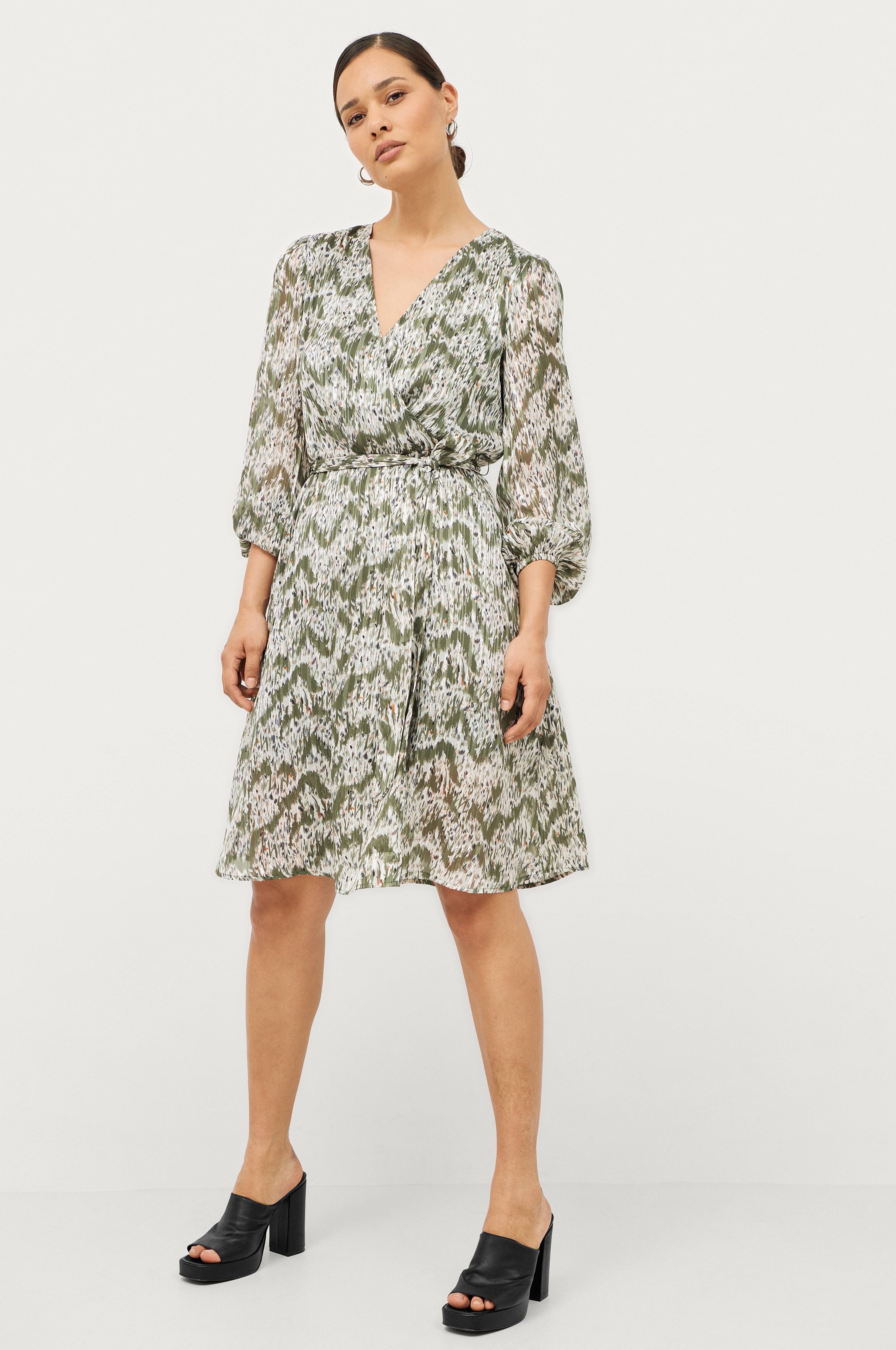 • Slå-om design med knap i siden• Ballonærmer med elastiske manchetter• Bindebælte ved taljen• Tynd, vævet kvalitet med glimmertråd• Foret• Længde: 107 cm i størrelse S