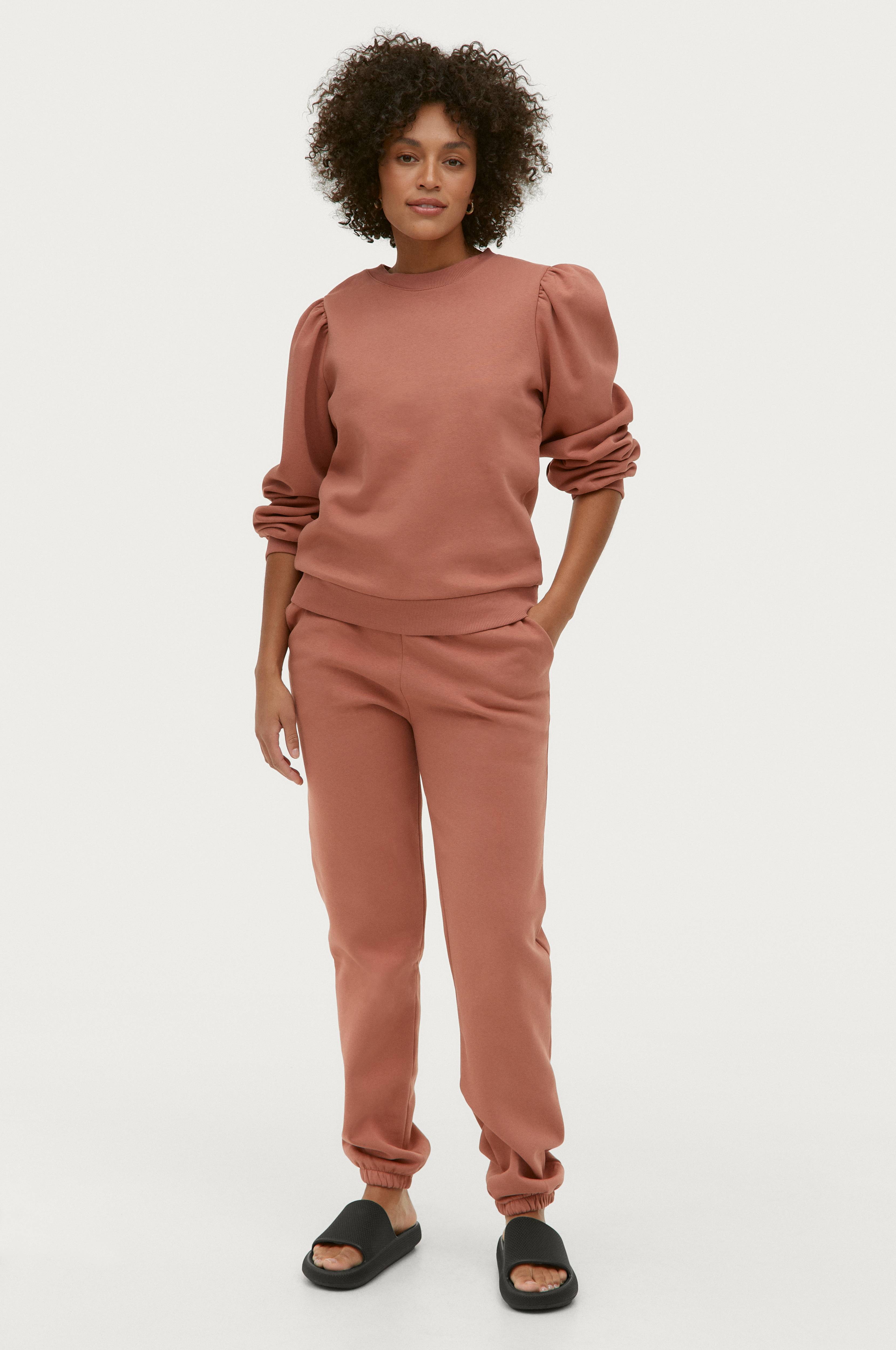 Modell med vida ben som har infälld resår i benslut. Påsydd linning med infälld resår och dragsko med glittrigt band. Två snedskurna fickor fram. Beninnerlängd ca 82 cm i stl S.