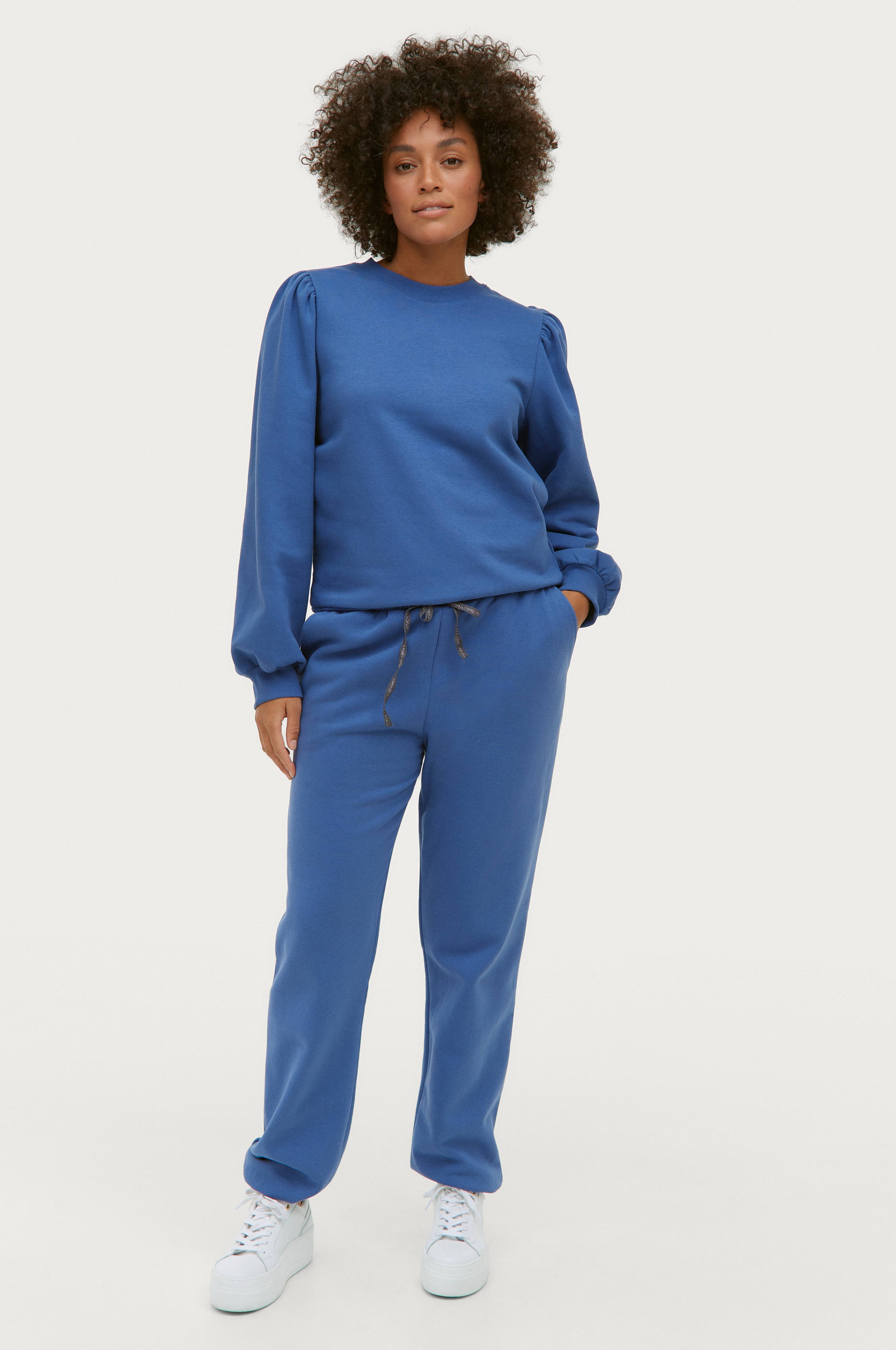 Modell med vida ben som har infälld resår i benslut. Påsydd linning med infälld resår och dragsko med glittrigt band. Två snedskurna fickor fram. Beninnerlängd ca 82 cm i stl S.