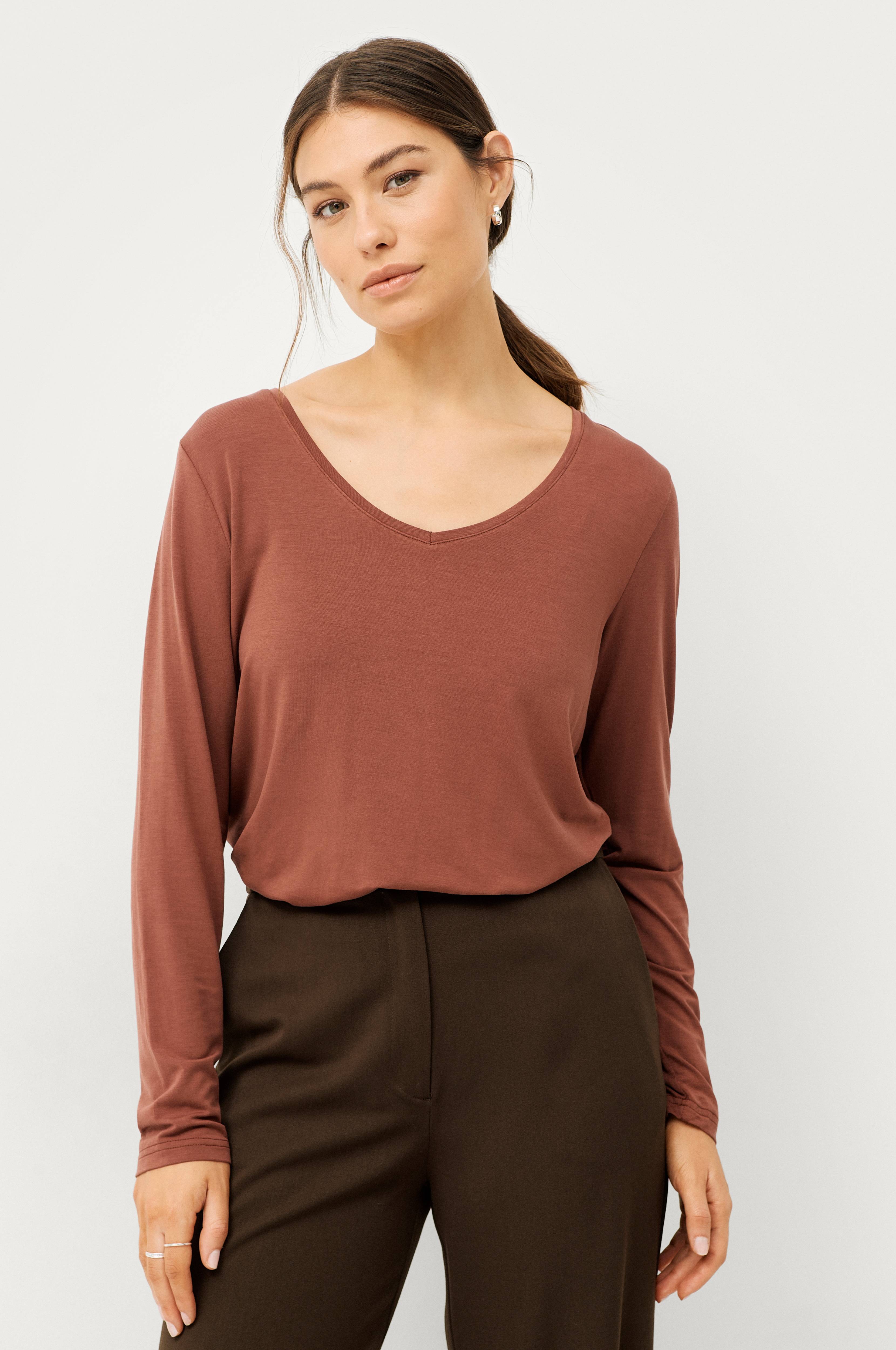 • Fremstillet af blød lyocell med stræk • V-formet halsudskæring • Langt ærme • Tøjet indeholder lyocell, som er et vedvarende materiale, og hvor fremstillingsprocessen sker i et lukket system, hvor alle ressourcer genanvendes og genbruges. Det har lavere miljøpåvirkning og kræver mindre vand end bomuld.