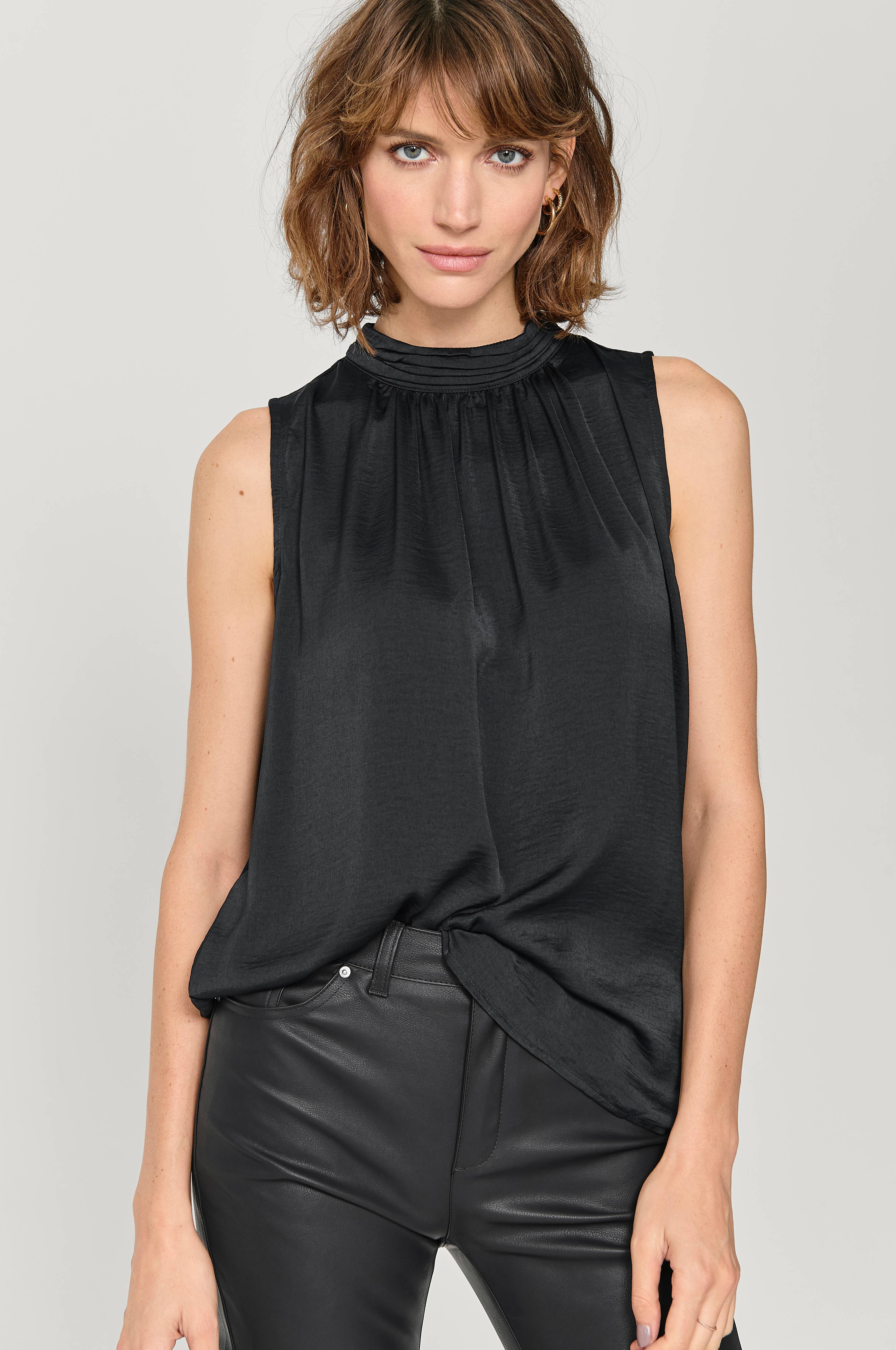 Top Aileen Top fra Saint Tropez. Ærmeløs model i lige design med rynkning rundt i halsen og halvhøj krave med lagte draperingslæg og slids med knapper i nakken. Vævet kvalitet med blødt fald.