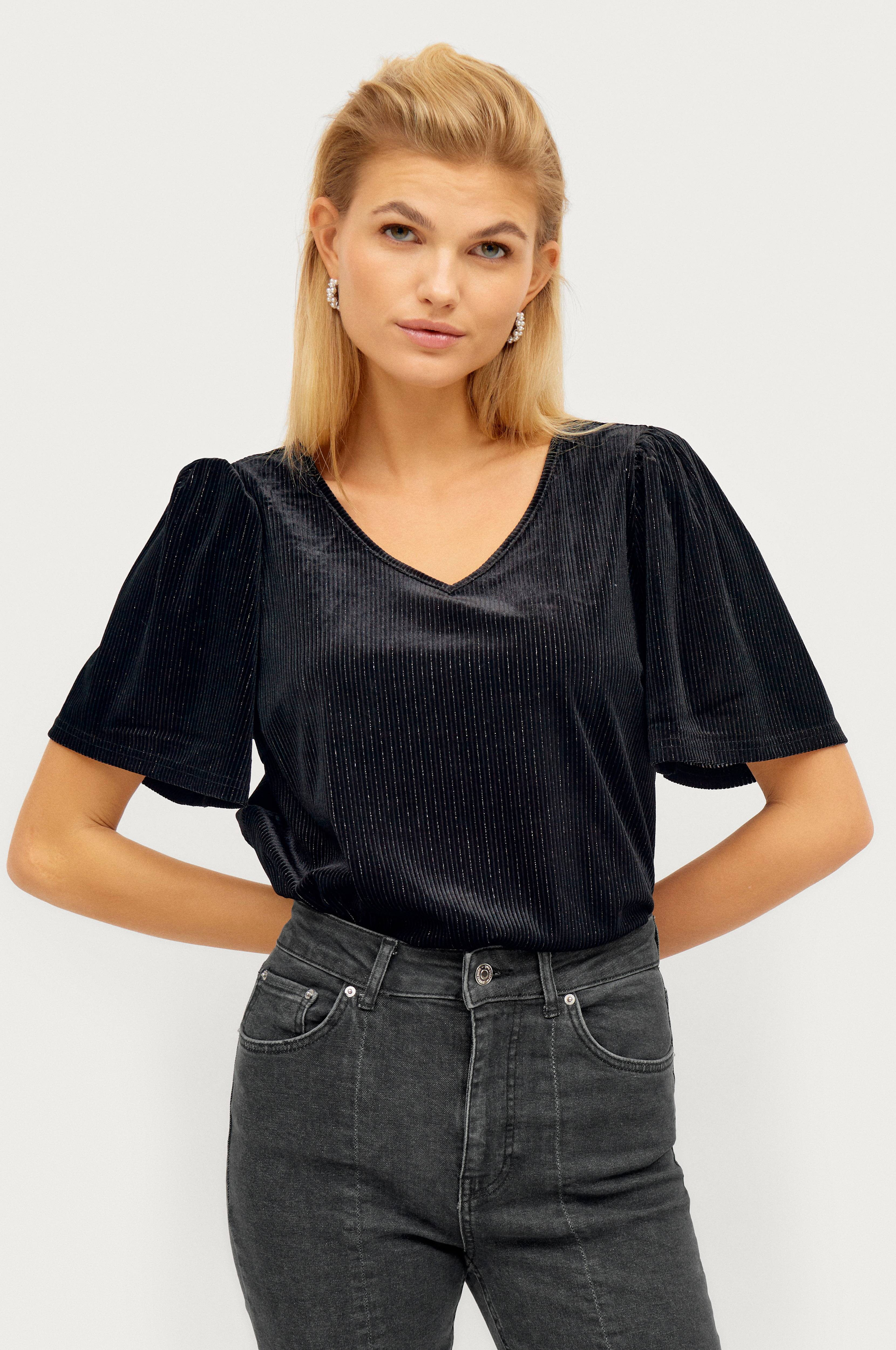 • Top i ribbet fløjl med glimmertråd• V-udskæring• Korte sommerfugleærmer