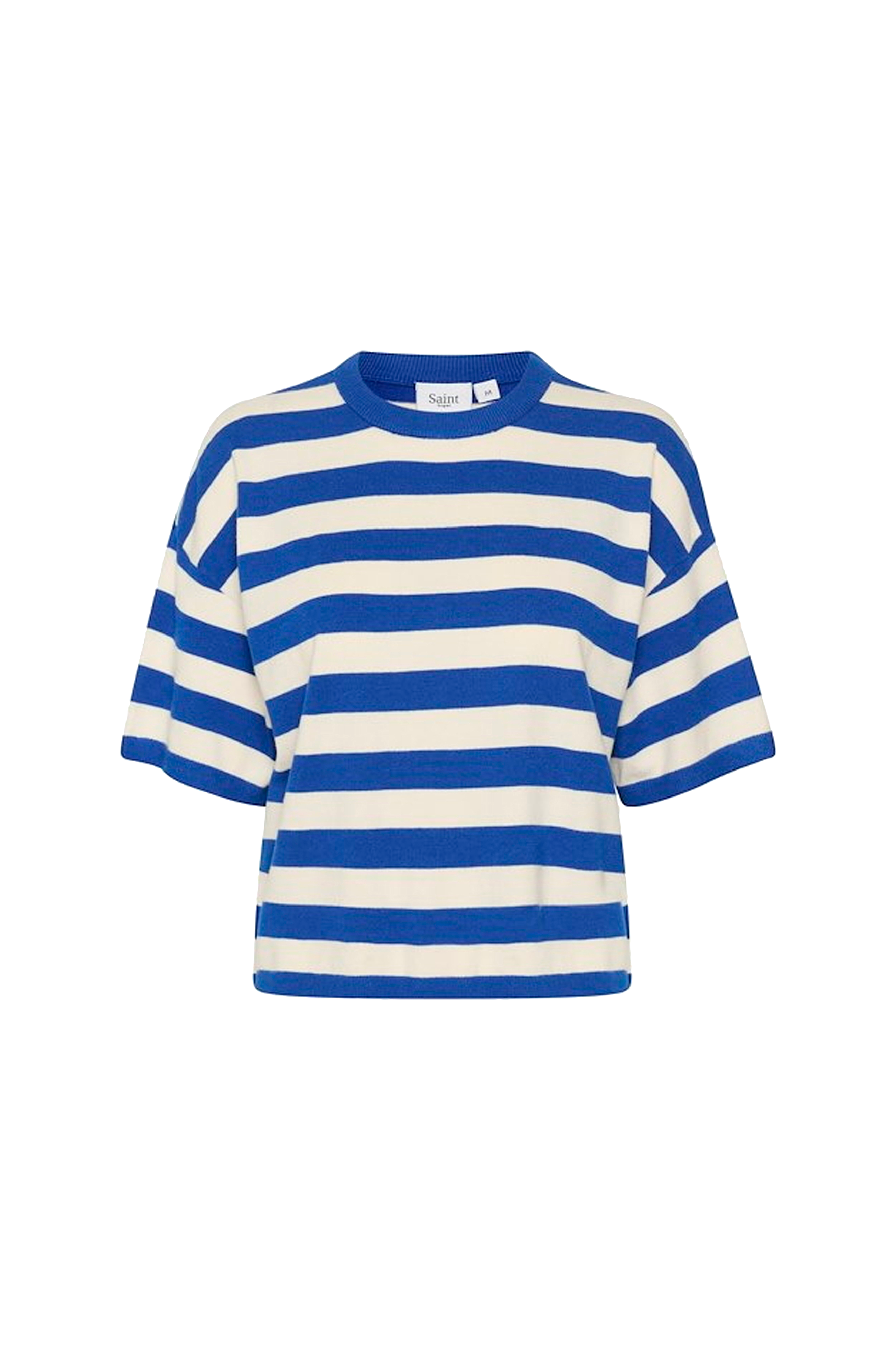 • Lige model med strikkede striber• Rund hals med ribkant• Nedsænket skulder med kort ærme• Smal ribstrik ved manchetterne og ved nederste kant