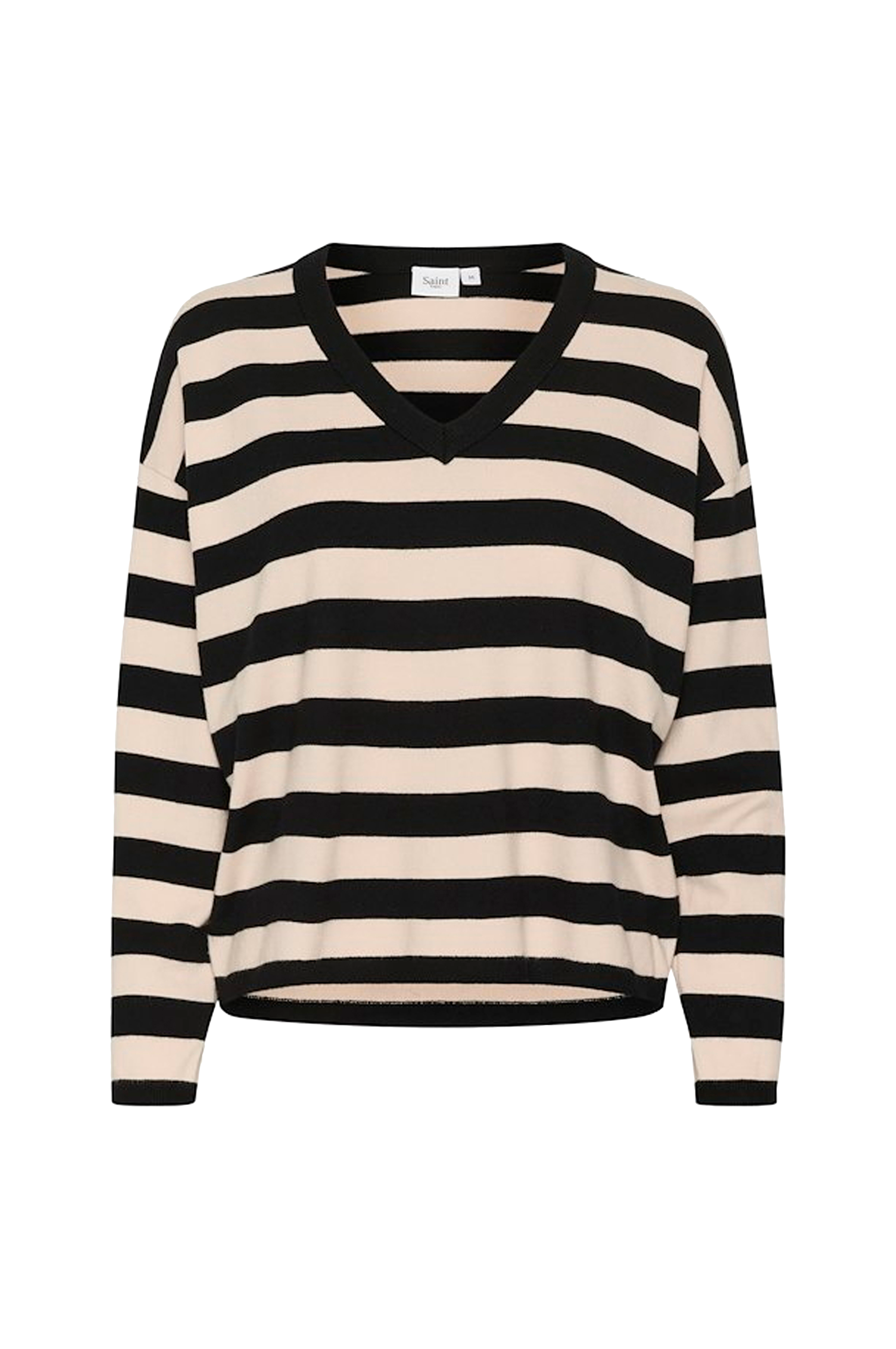 • Bred, lige model med strikkede striber• V-formet halsudskæring med ribstrikket kant• Nedsænket skulder med langt ærme• Tynd ribkant ved manchetterne og ved nederste kant