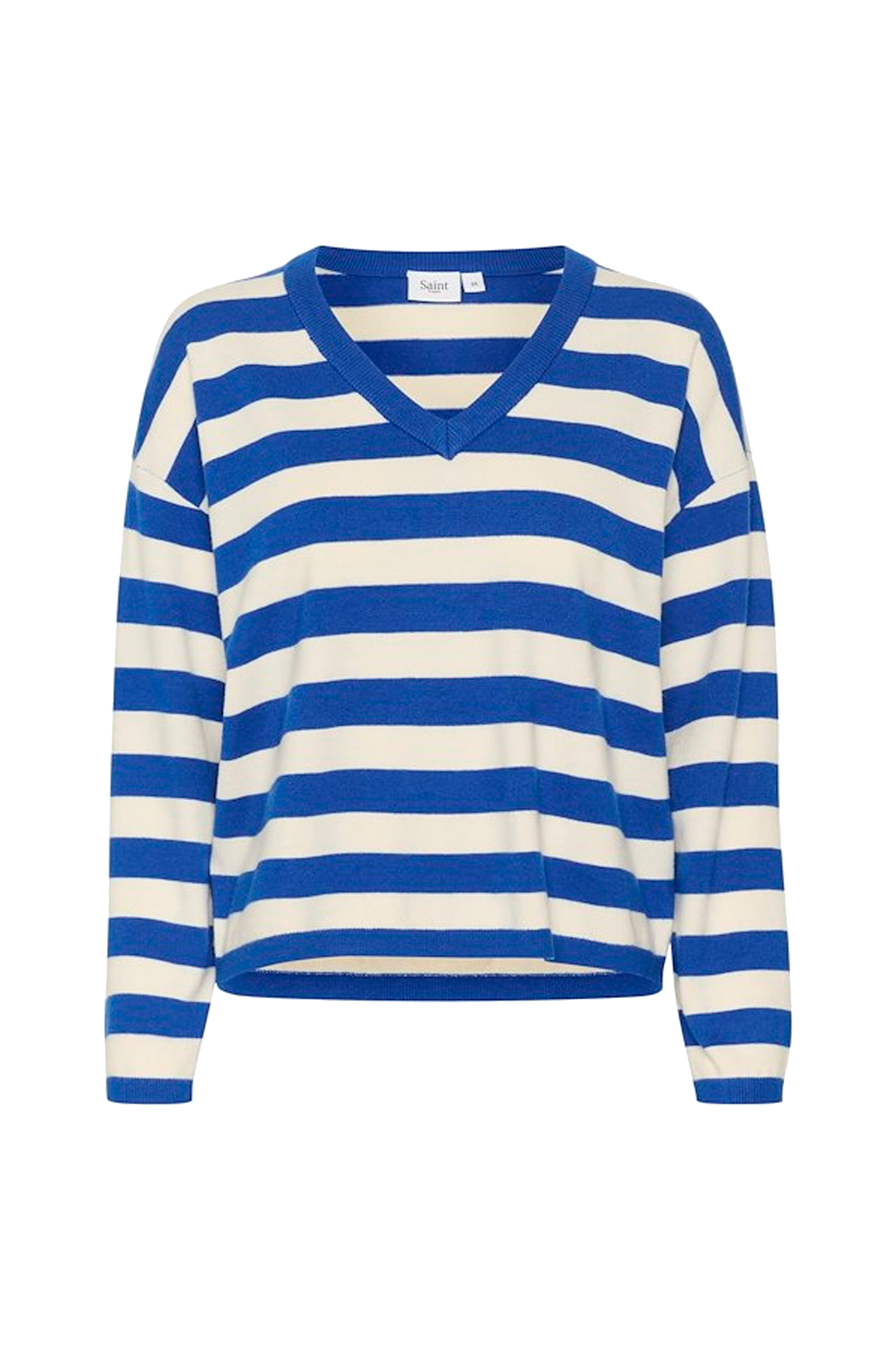 • Bred, lige model med strikkede striber• V-formet halsudskæring med ribstrikket kant• Nedsænket skulder med langt ærme• Tynd ribkant ved manchetterne og ved nederste kant