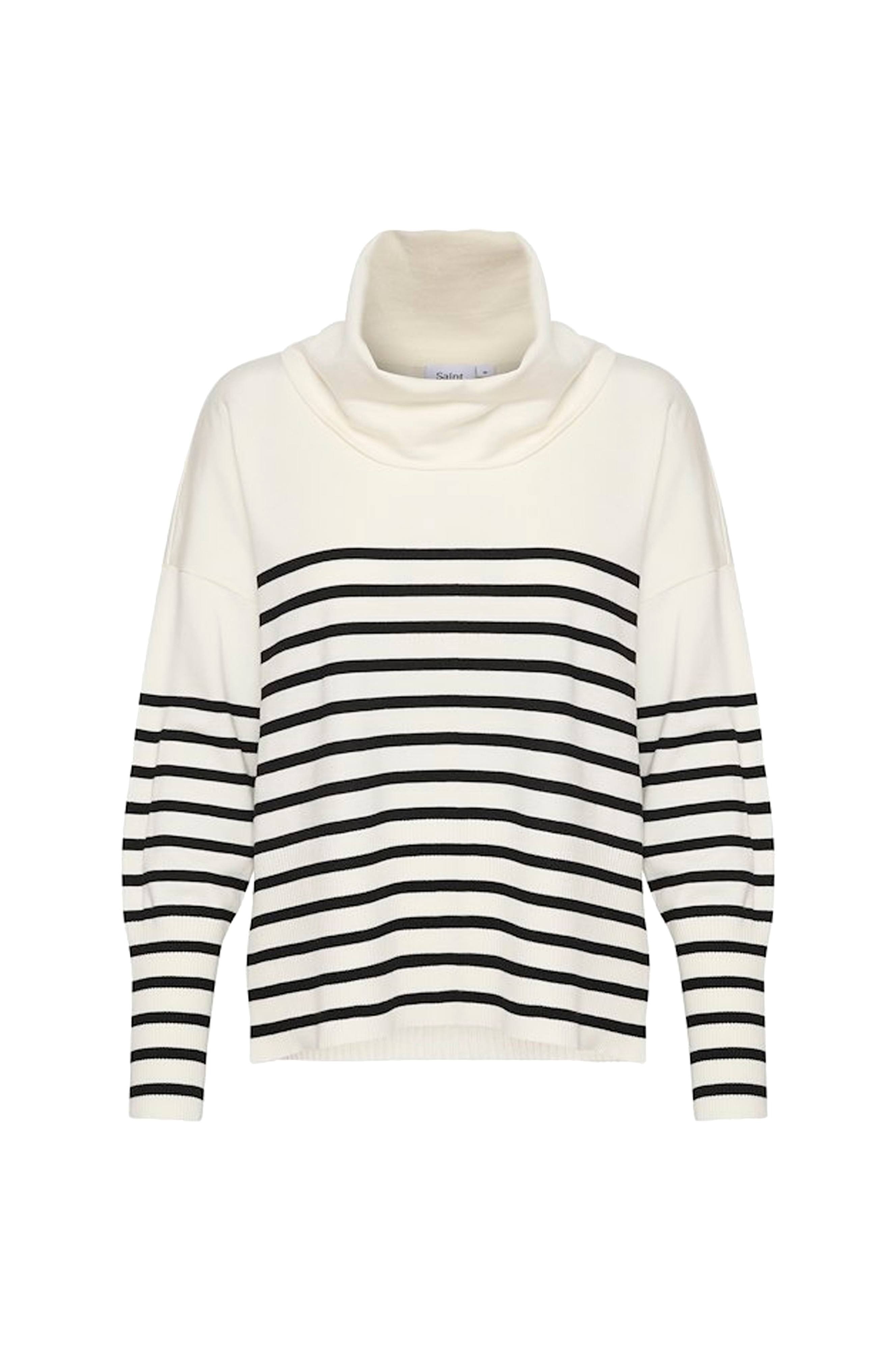 • Lige, stribet model• Høj, bred krave• Nedsænket skulder• Langt ærme med bred ribstrik ved manchetterne• Bred, ribstrikket kant nederst med slids i siderne