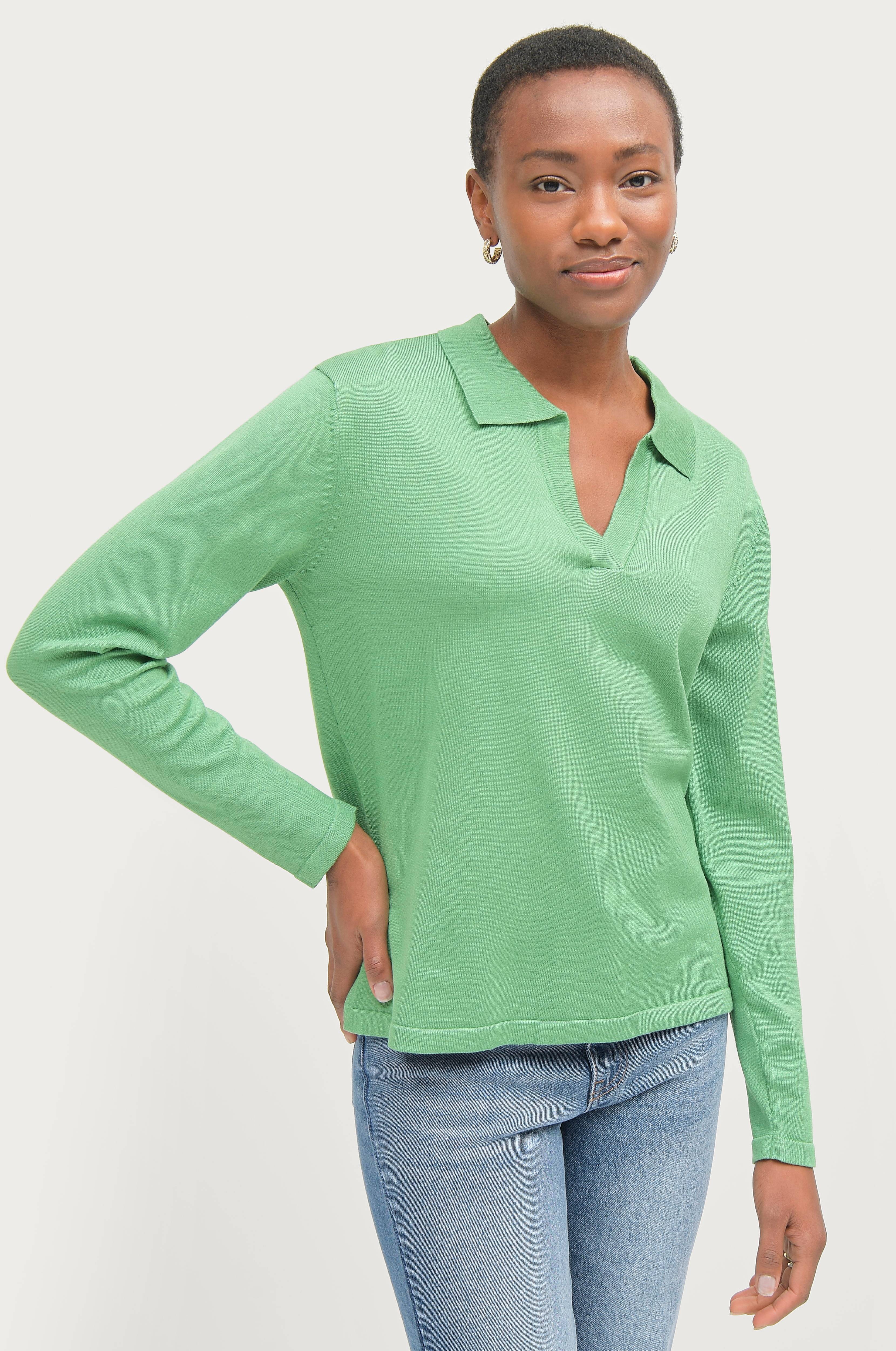 • Fintstrikket trøje• Ribbet krave• V-formet halsudskæring