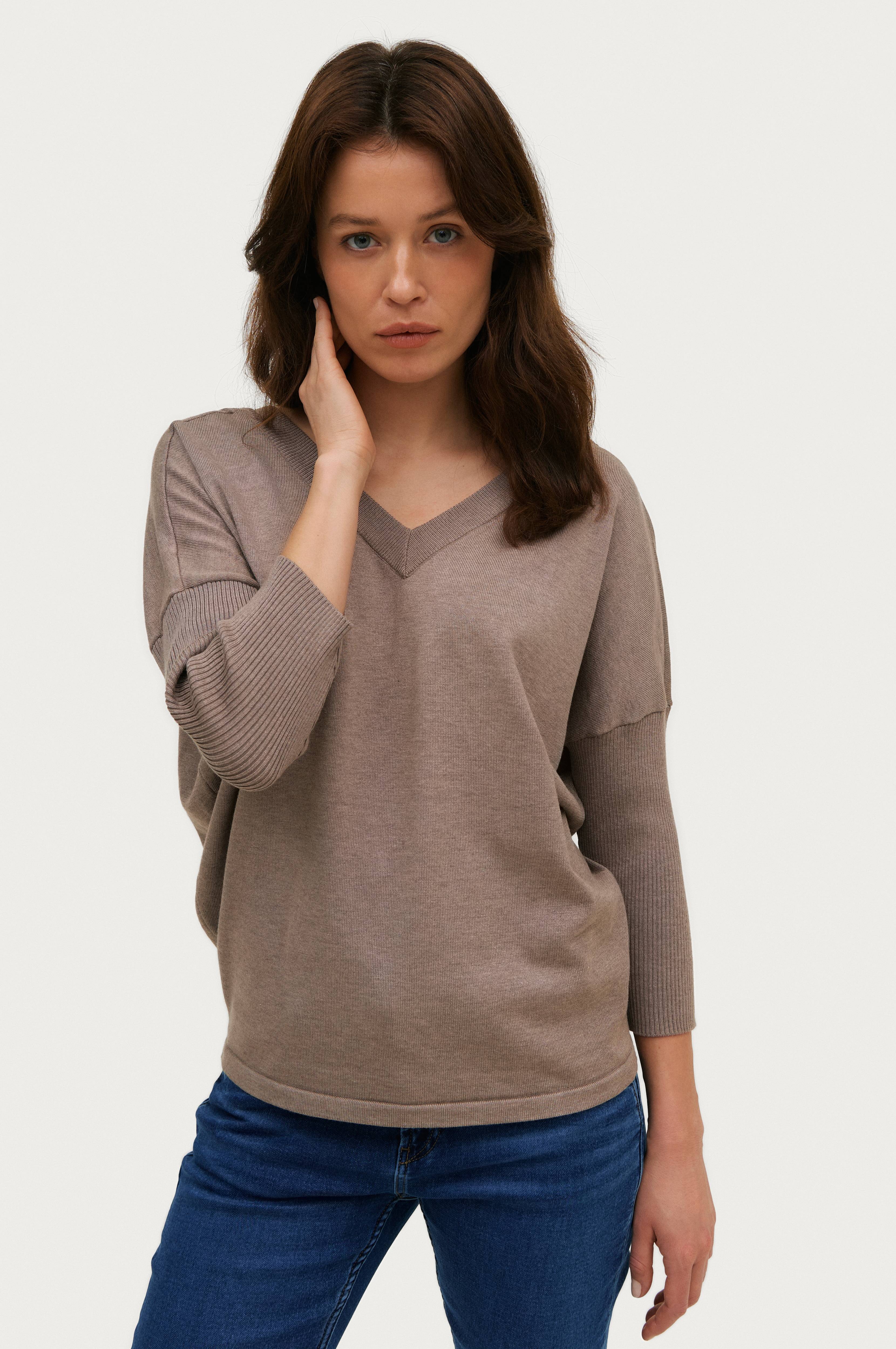 • V-udskæring foran og bagpå• Vidde på toppen• Ribbede flagermusærmer• Fintstrikket kvalitet