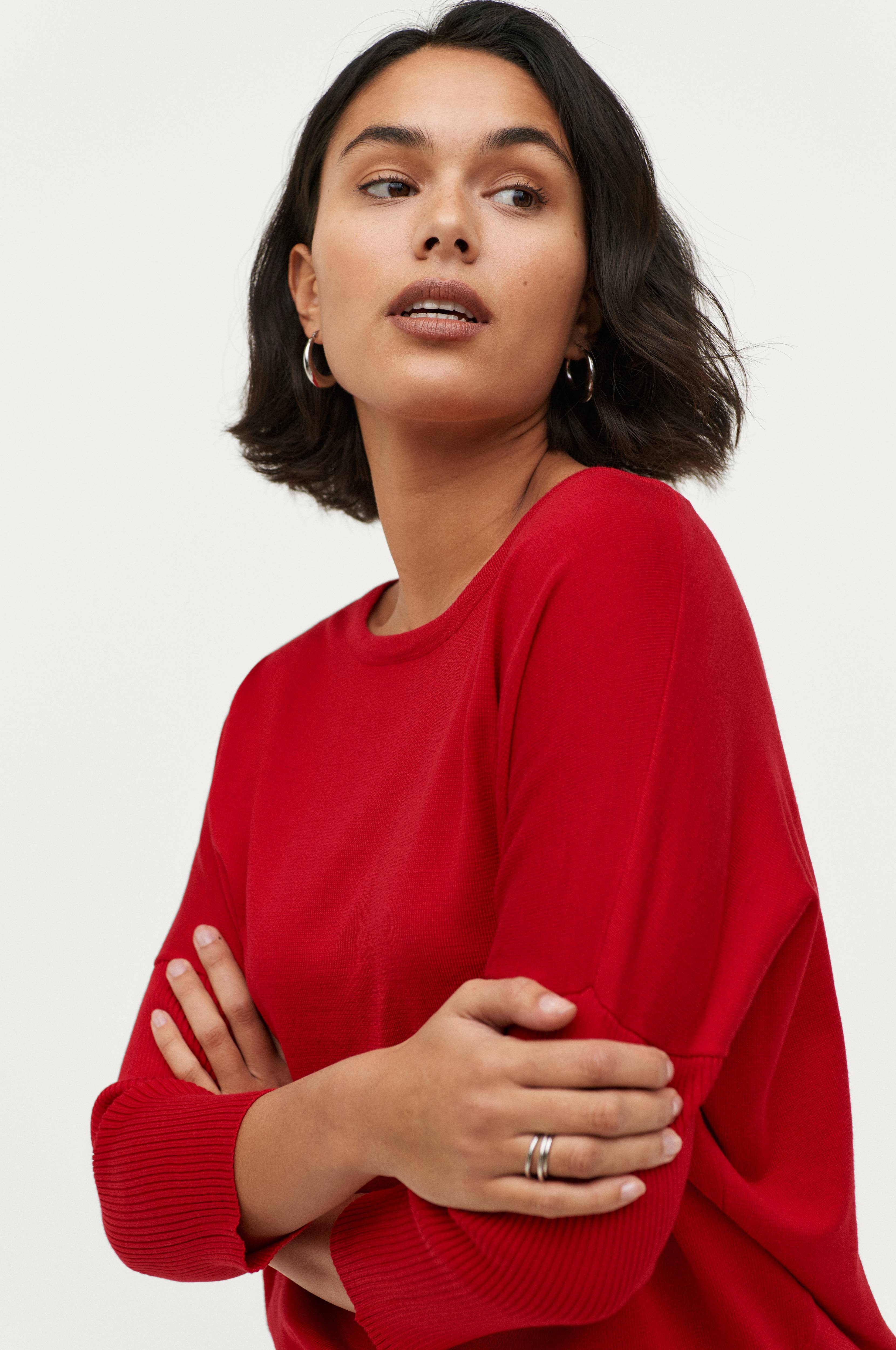Trøje fra Saint Tropez i glatstrikket kvalitet med ribstrikket ærme. Vid model, som bliver smallere nedefter samt med lavere skuldersømme og 3/4-langt ærme. Flot, vid halsudskæring med ribstrikket kant samt smal søm forneden. Længde ca. 60 cm i str. M.