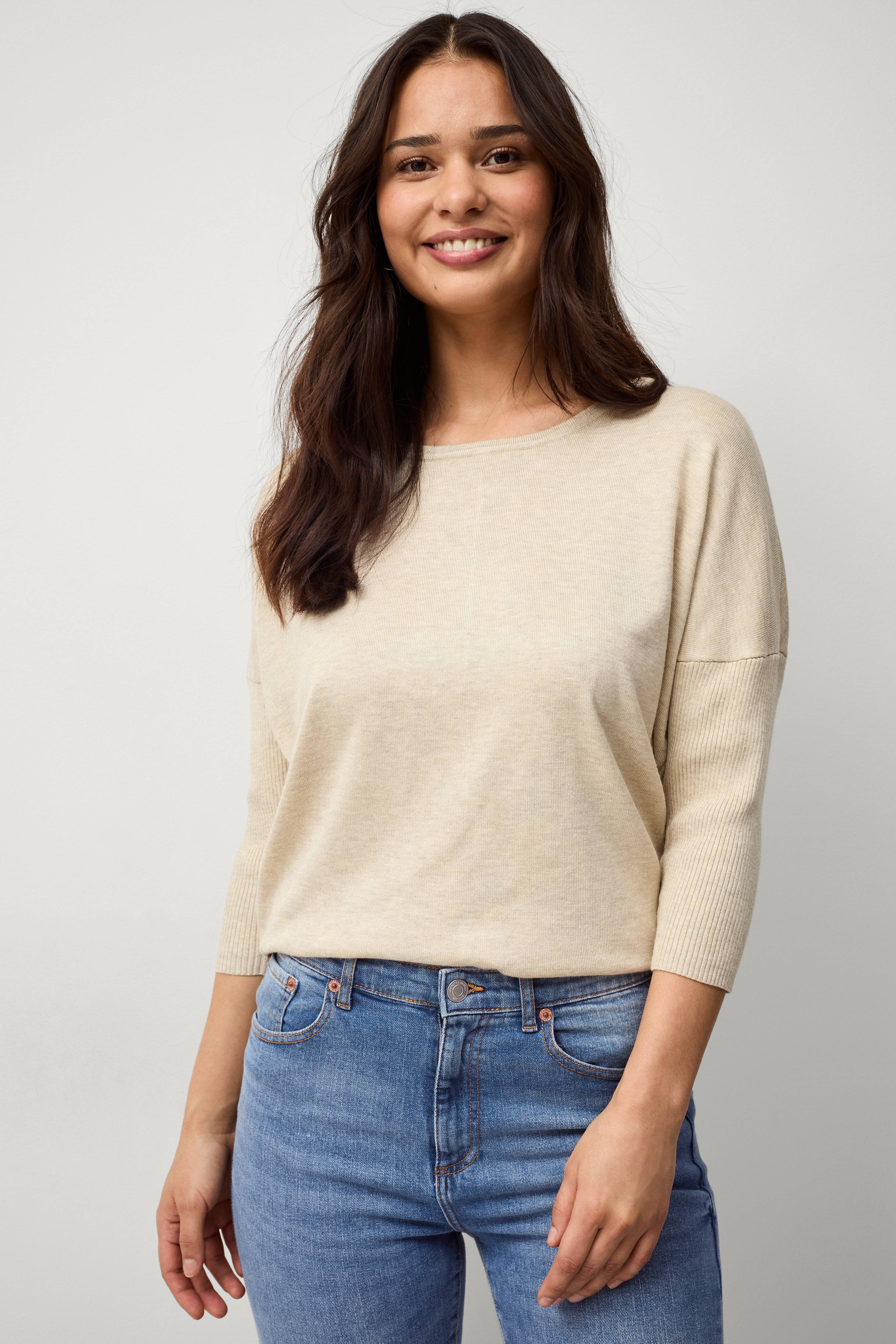 Trøje fra Saint Tropez i glatstrikket kvalitet med ribstrikket ærme. Vid model, som bliver smallere nedefter samt med lavere skuldersømme og 3/4-langt ærme. Flot, vid halsudskæring med ribstrikket kant samt smal søm forneden. Længde ca. 60 cm i str. M.