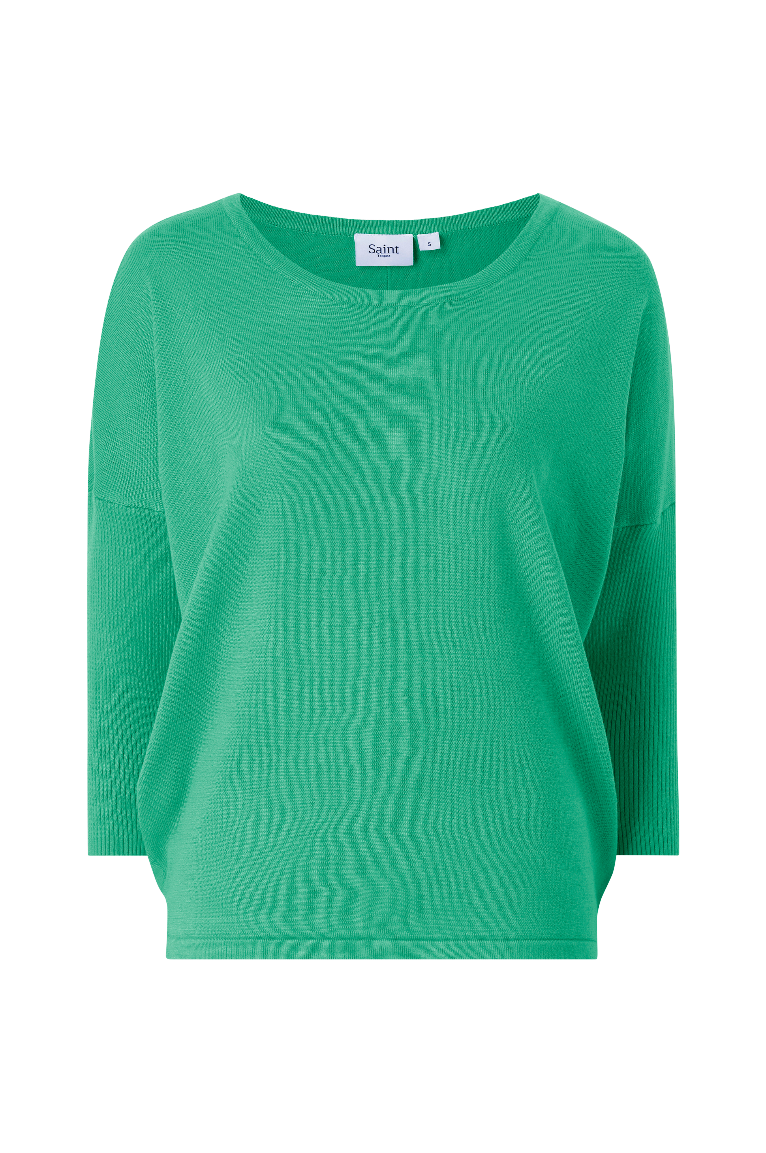 Trøje fra Saint Tropez i glatstrikket kvalitet med ribstrikket ærme. Vid model, som bliver smallere nedefter samt med lavere skuldersømme og 3/4-langt ærme. Flot, vid halsudskæring med ribstrikket kant samt smal søm forneden. Længde ca. 60 cm i str. M.