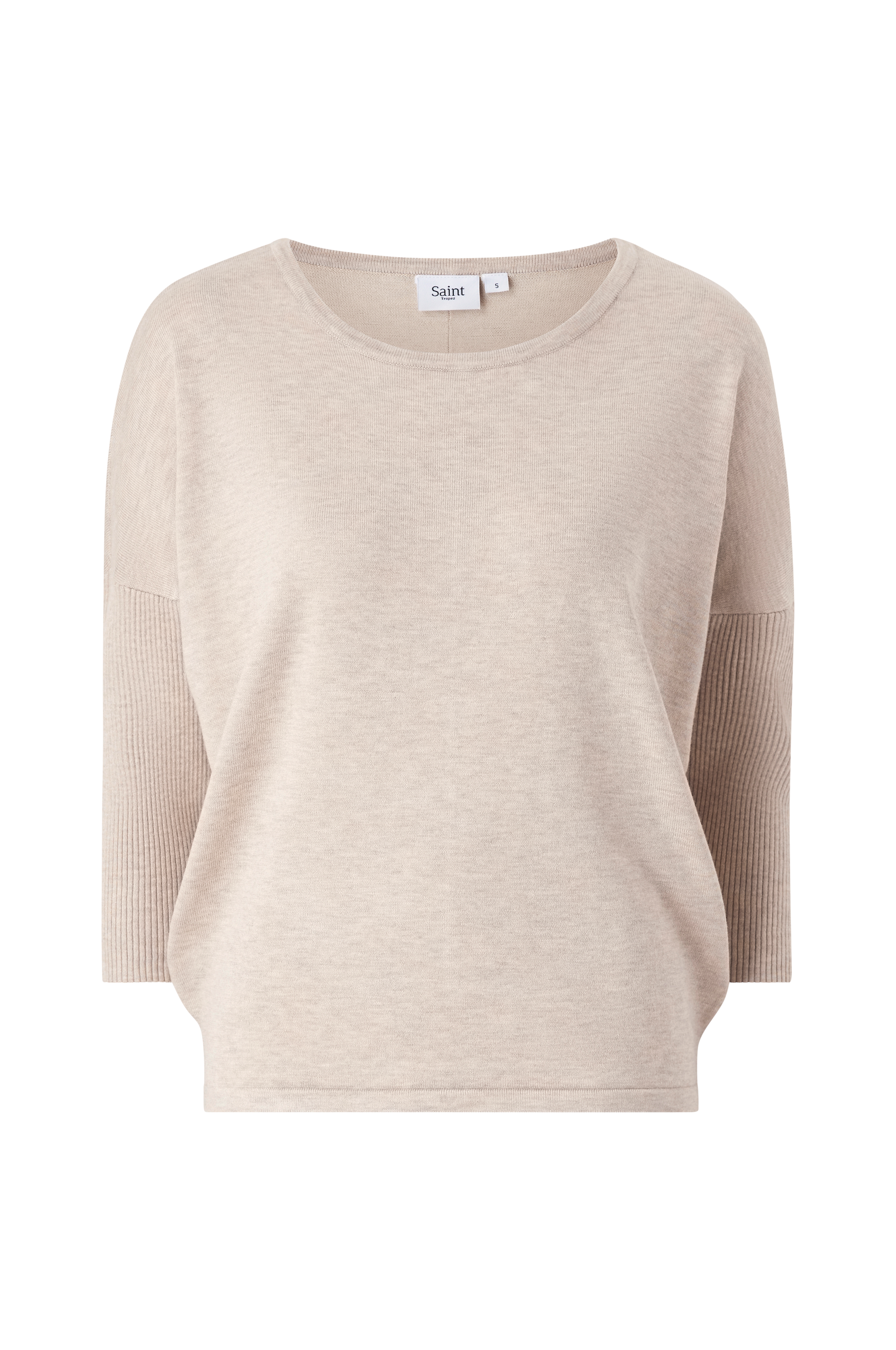 Trøje fra Saint Tropez i glatstrikket kvalitet med ribstrikket ærme. Vid model, som bliver smallere nedefter samt med lavere skuldersømme og 3/4-langt ærme. Flot, vid halsudskæring med ribstrikket kant samt smal søm forneden. Længde ca. 60 cm i str. M.
