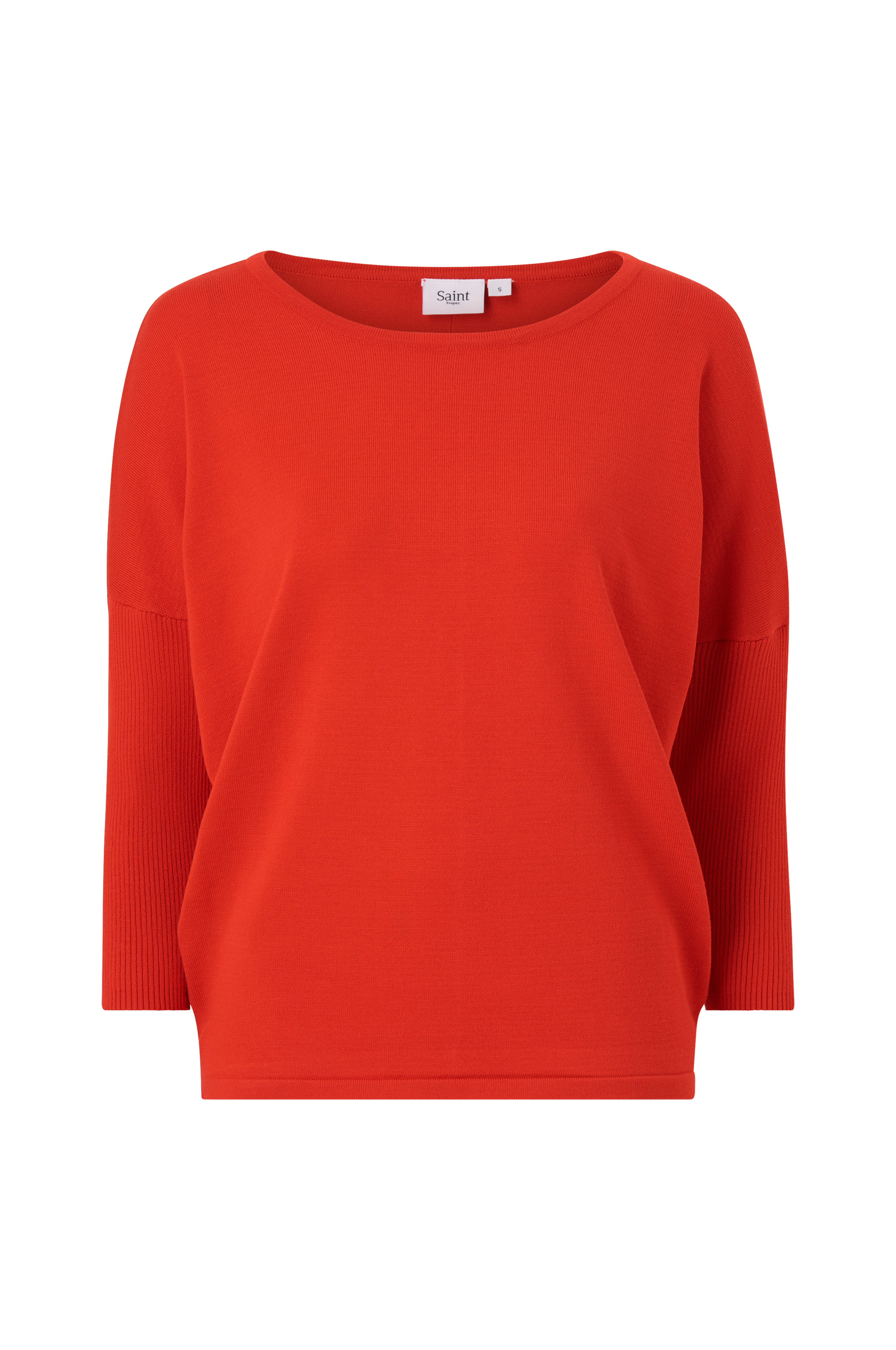 Trøje fra Saint Tropez i glatstrikket kvalitet med ribstrikket ærme. Vid model, som bliver smallere nedefter samt med lavere skuldersømme og 3/4-langt ærme. Flot, vid halsudskæring med ribstrikket kant samt smal søm forneden. Længde ca. 60 cm i str. M.