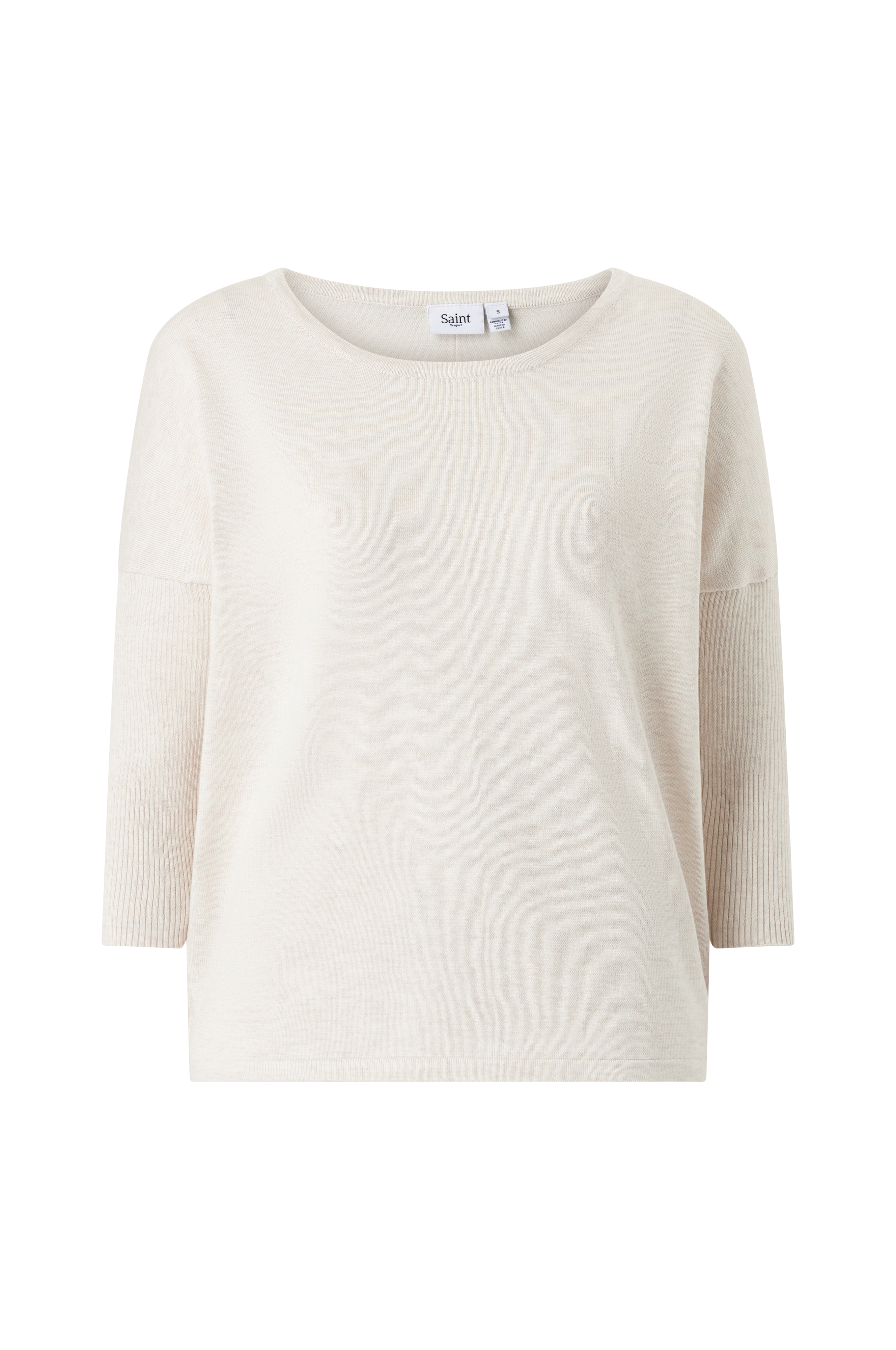 Trøje fra Saint Tropez i glatstrikket kvalitet med ribstrikket ærme. Vid model, som bliver smallere nedefter samt med lavere skuldersømme og 3/4-langt ærme. Flot, vid halsudskæring med ribstrikket kant samt smal søm forneden. Længde ca. 60 cm i str. M.