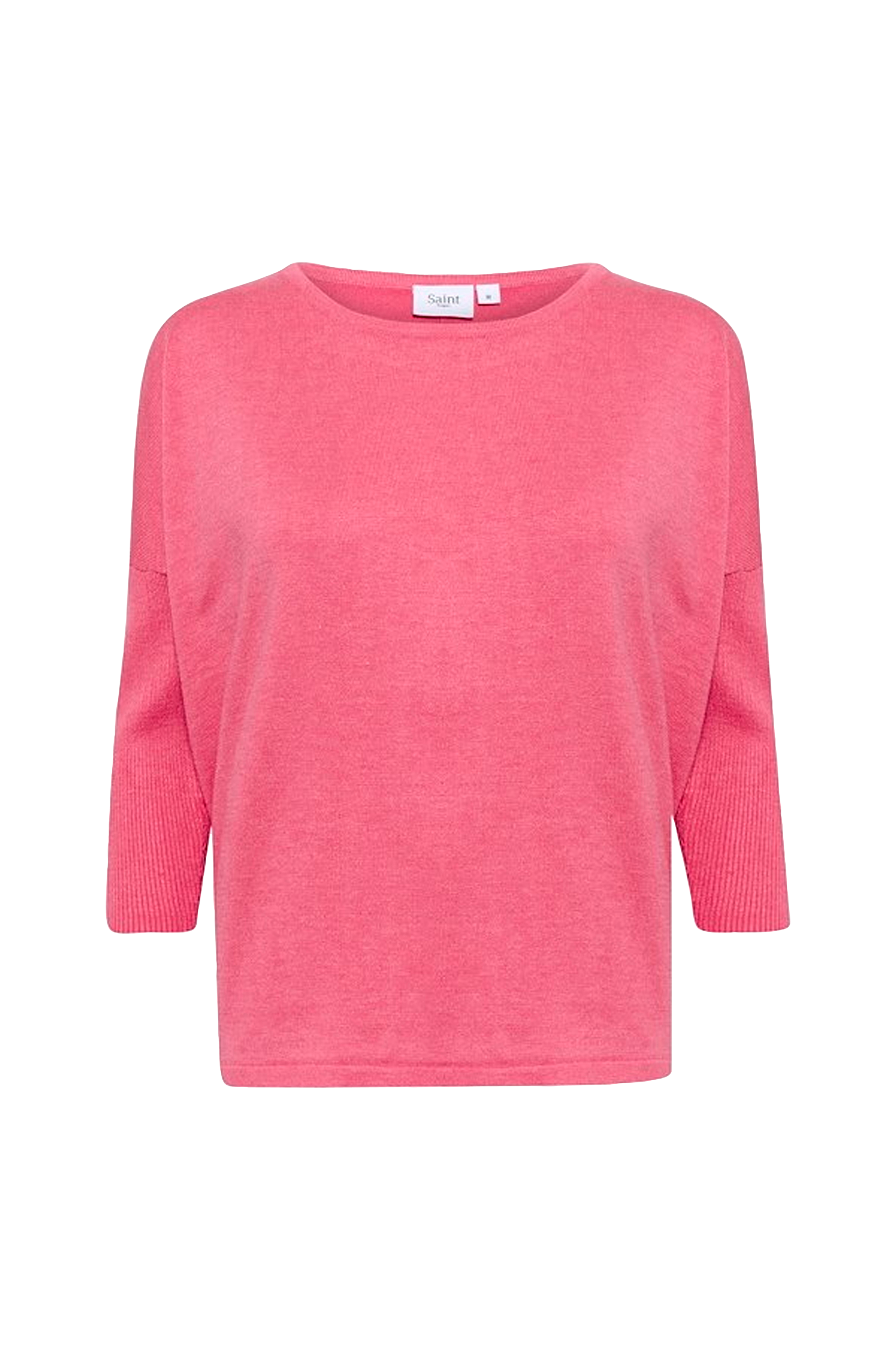 Trøje fra Saint Tropez i glatstrikket kvalitet med ribstrikket ærme. Vid model, som bliver smallere nedefter samt med lavere skuldersømme og 3/4-langt ærme. Flot, vid halsudskæring med ribstrikket kant samt smal søm forneden. Længde ca. 60 cm i str. M.
