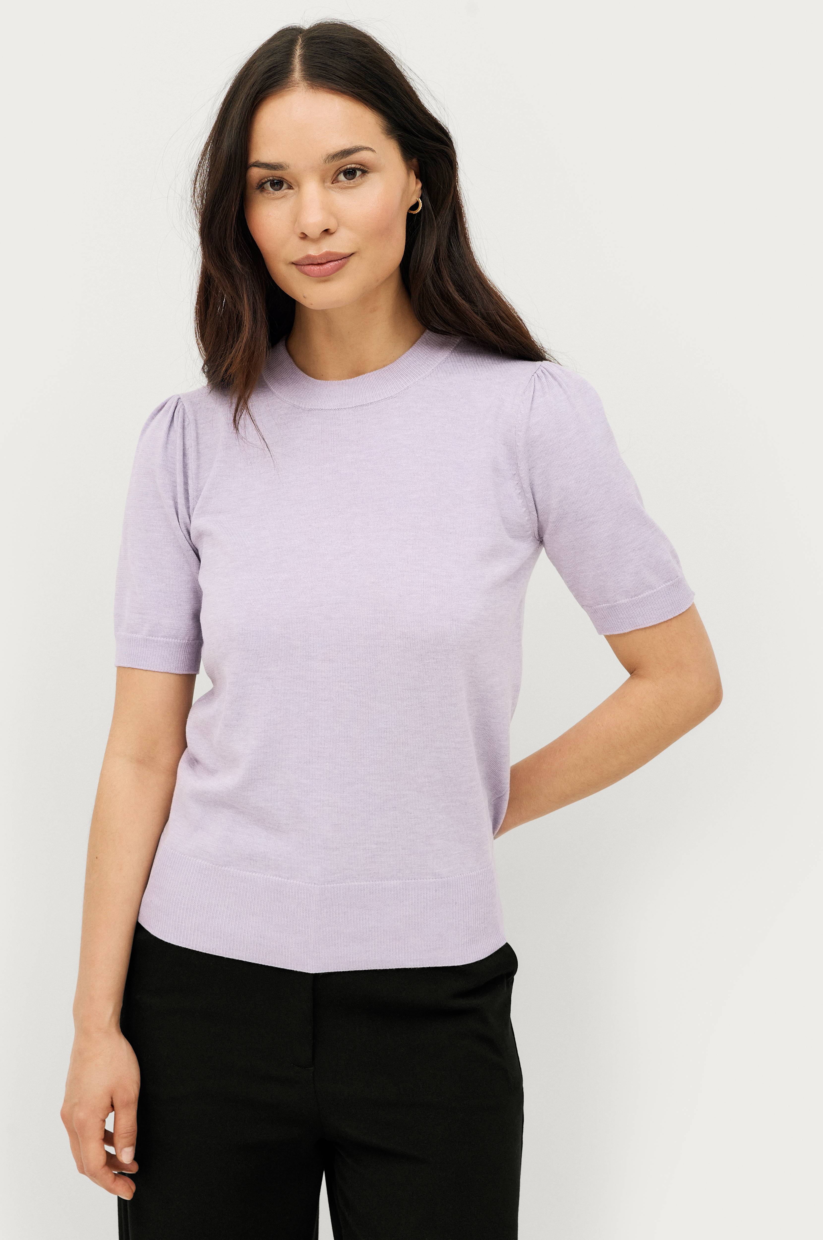 • Fintstrikket trøje• Rund, ribbet halsudskæring• Kort ærme med ribbet kant• Ribbet søm