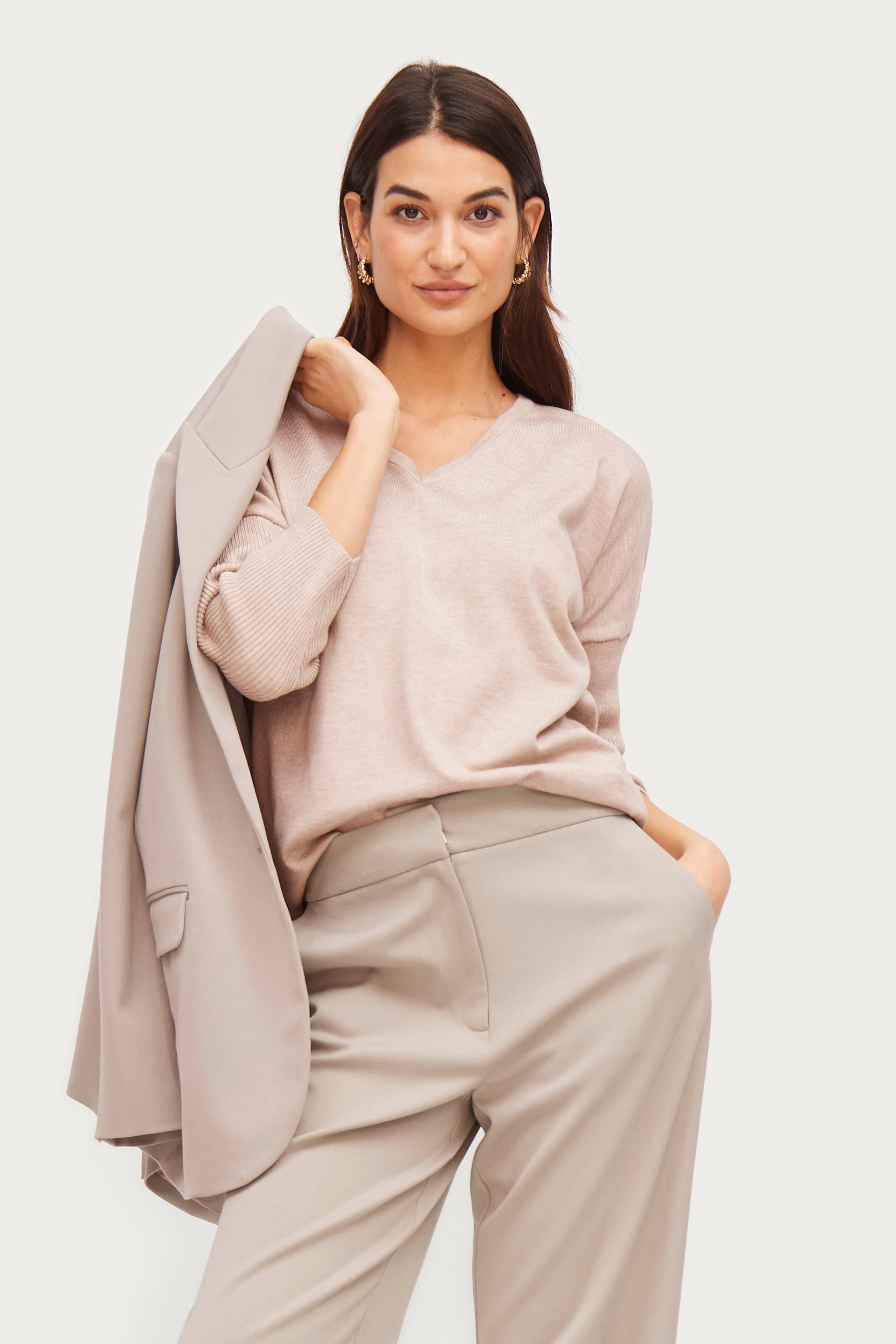 • V-udskæring• 3/4 lange, ribbede flagermusærmer• Fintstrikket kvalitet i viskoseblanding