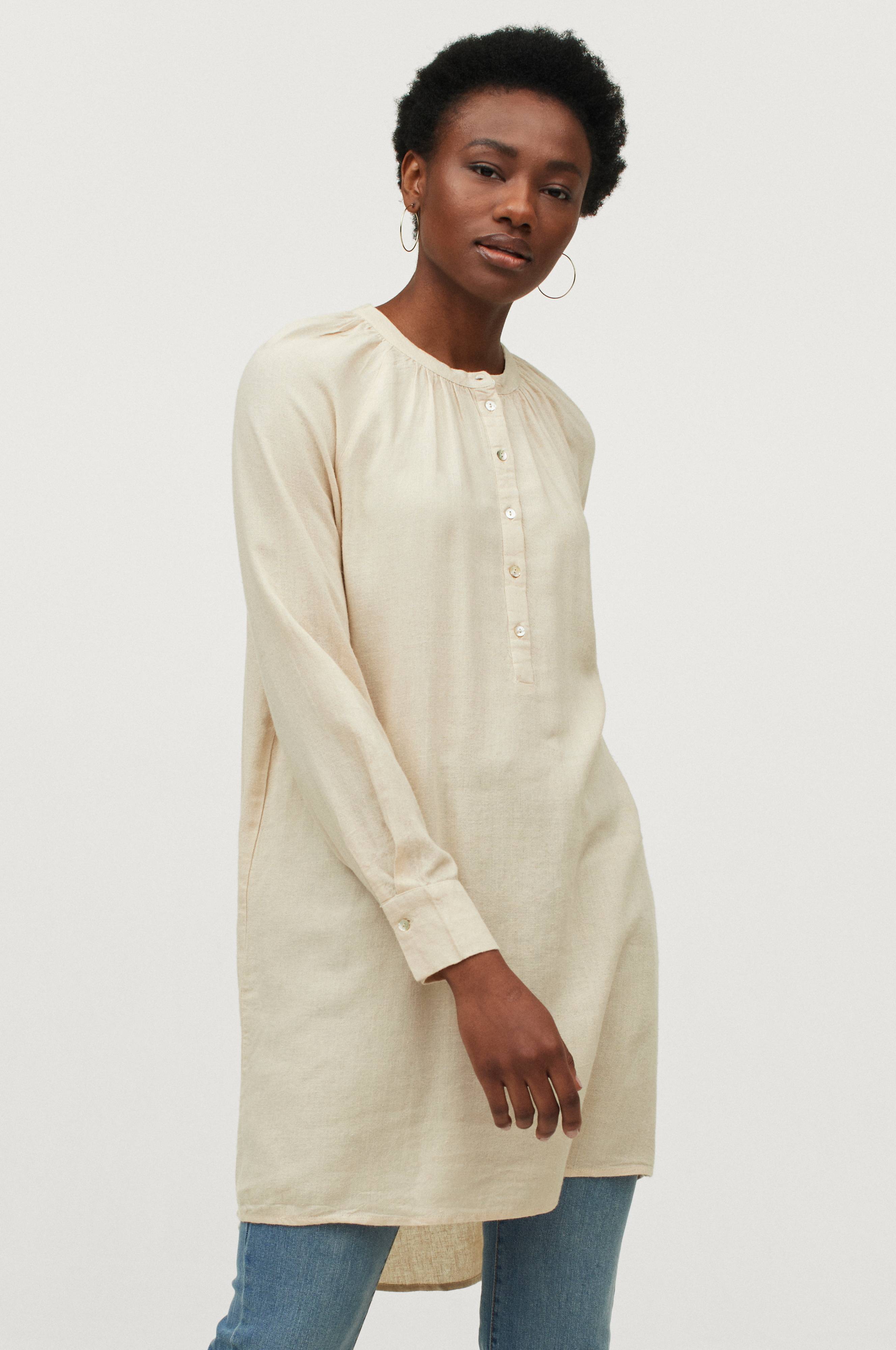 Tunika i vævet hør- og viskoseblanding med dejlig struktur. Rund hals med rynkning og knapper foran. Lange ærmer med manchet og knap i ærmekant. Afrundet, længere kant forneden bagpå. Længde foran ca. 85 cm i str. S.