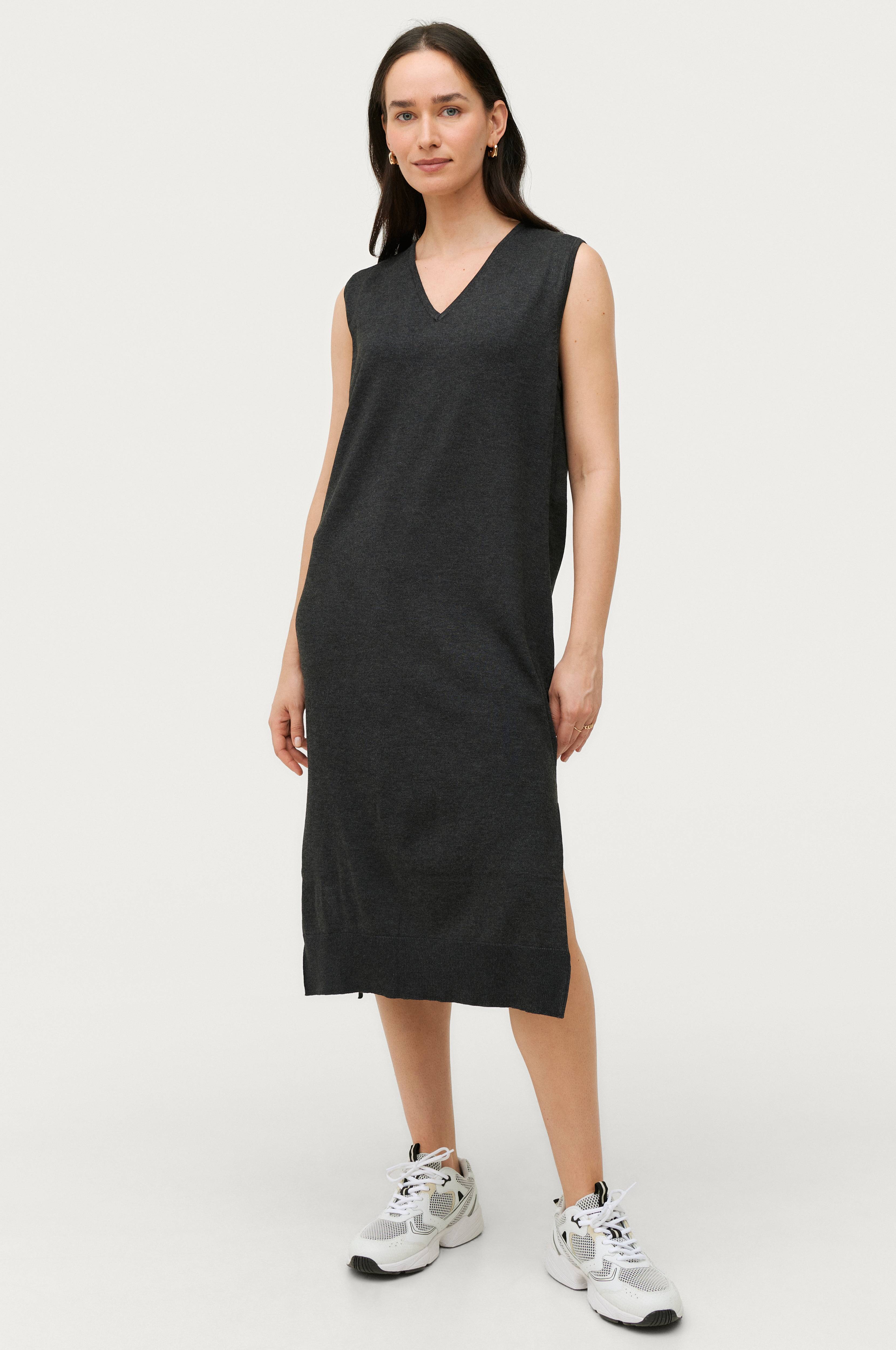 • Fintstrikket model med svaj• V-udskæring i halsen• Slidser nede i siderne med ribstrikket kant• Længde: 114 cm i størrelse S
