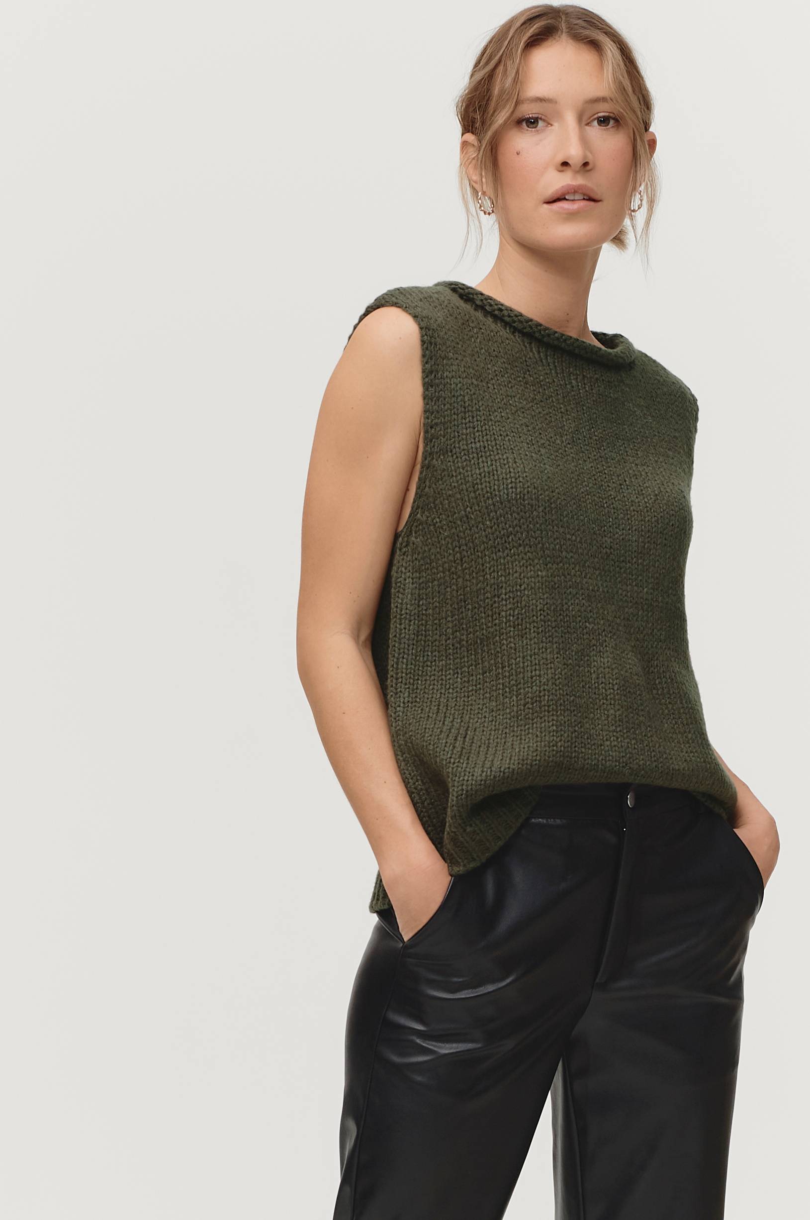 Strikket vest i blød kvalitet med uldandel. Rullet krave og ribstrikket kant forneden.