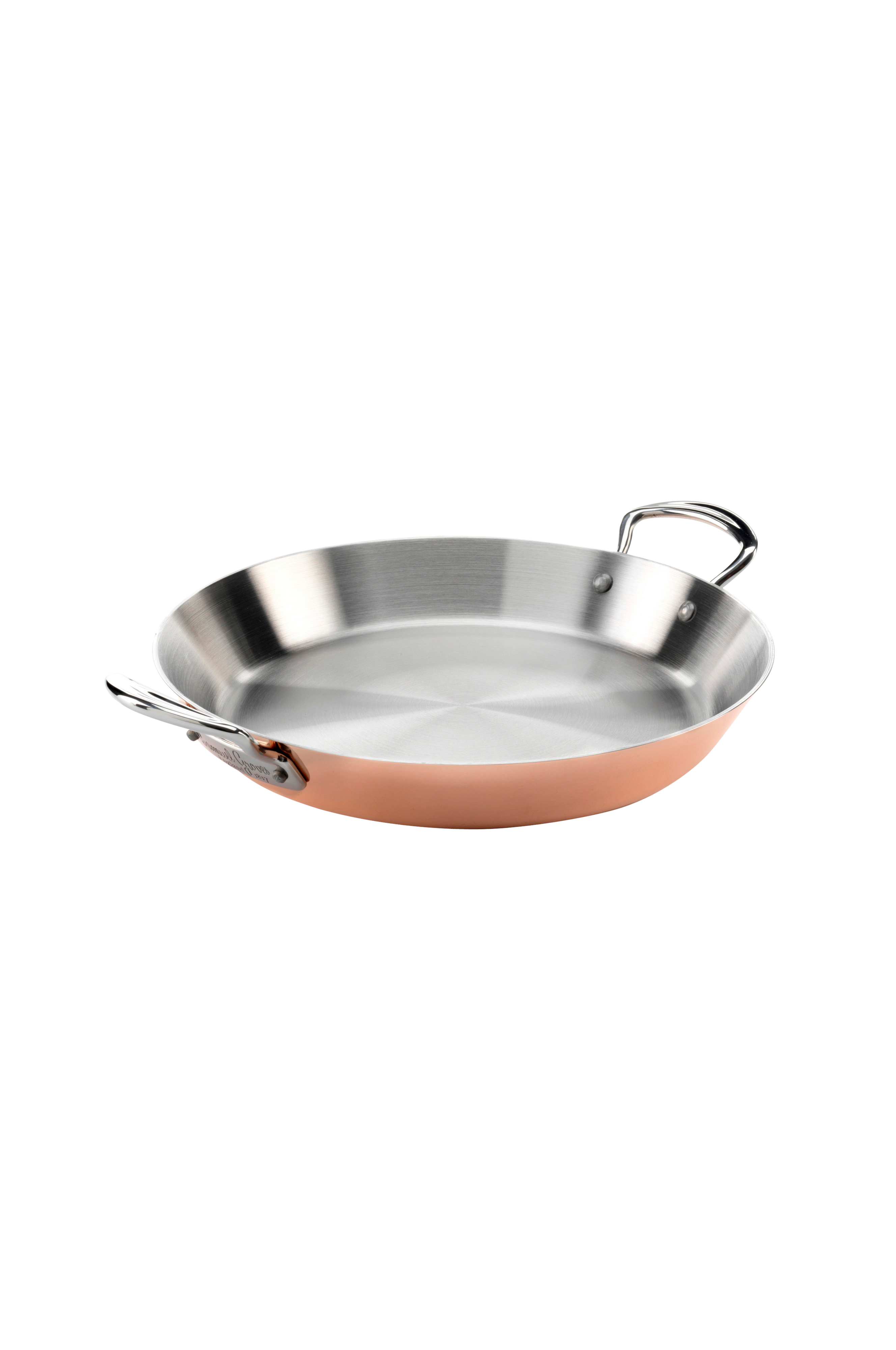 Paellapande fra Samuel Grove's Copper Induction-serie, 30 cm. En paellapande i rustfrit stål med et elegant, kobberbelagt ydre. Panden er et must, når du laver paella eller andre retter, der kræver plads og en stor stegefacade. Den er også fremragende til servering. Håndvask anbefales.
