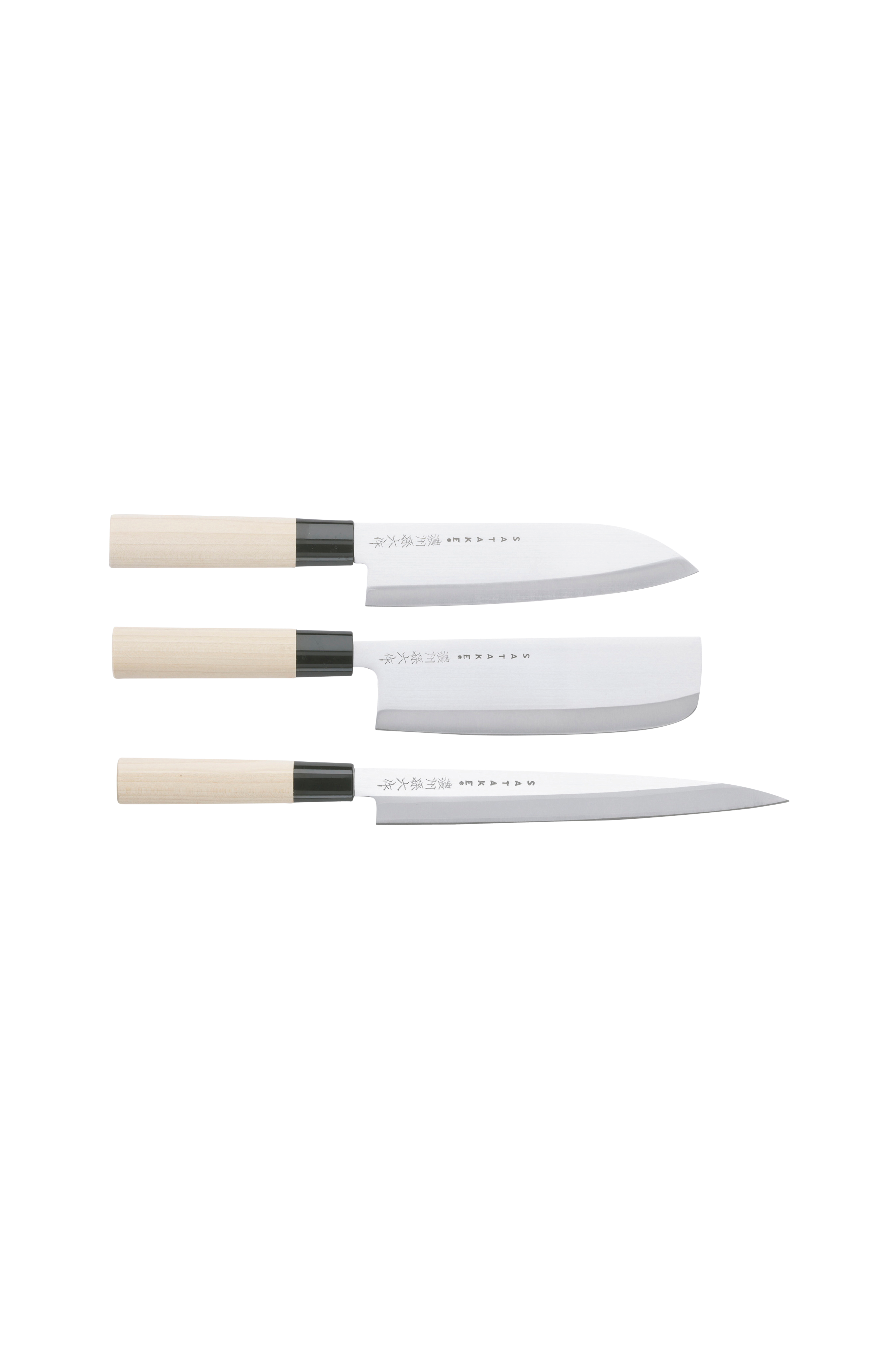 Et knivsæt med grøntsagshakker, sashimi/filetkniv og japansk kokkekniv/Santoku i en smuk balsaæske.