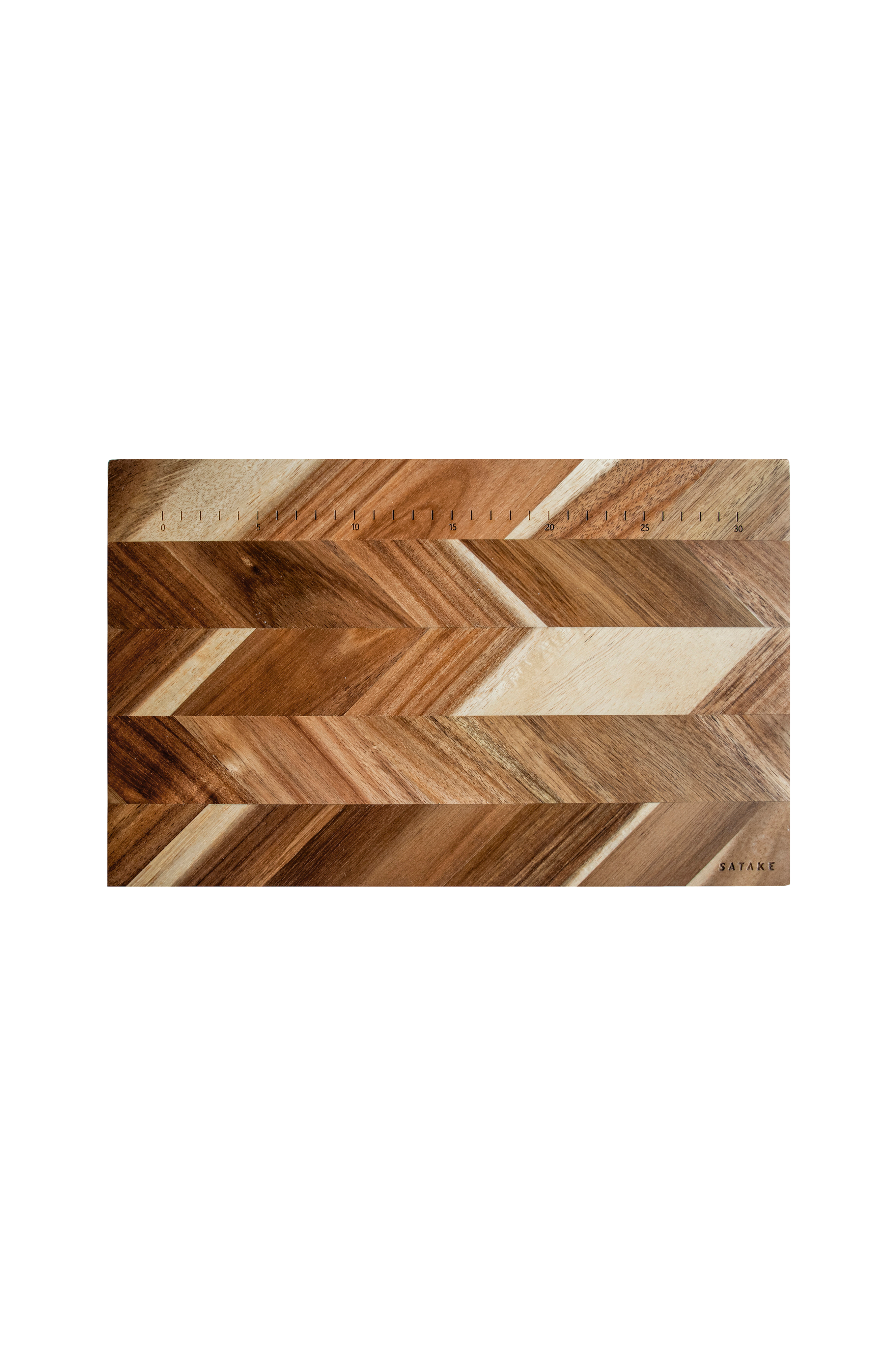 Smukt skærebræt af akacietræ. Brættet har centimetermarkeringer for at forenkle og øge præcisionen af tykkelsen ved udskæring af for eksempel zucchini, kød eller brød.