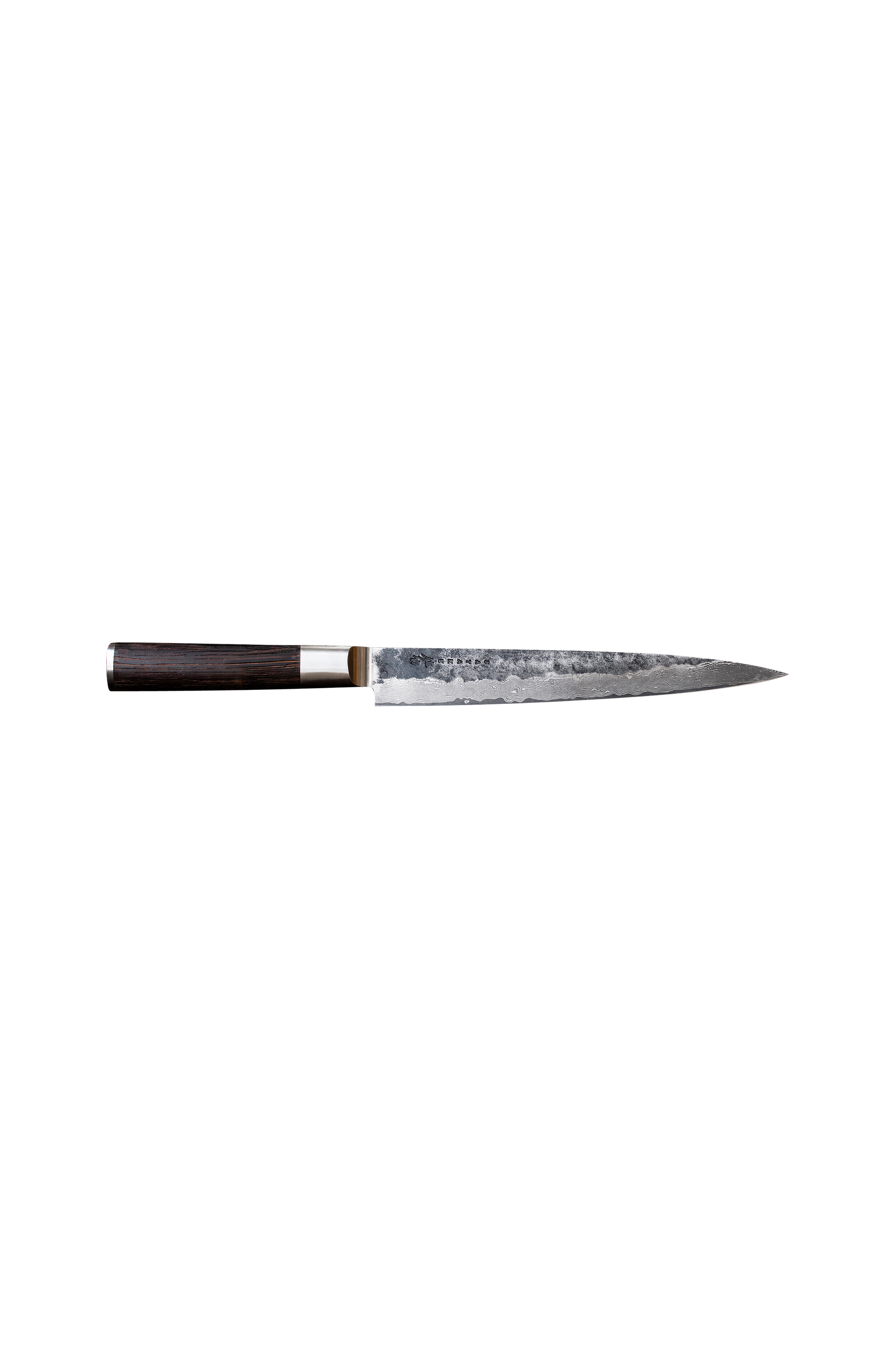 Kuro er en groft hamret kniv med vg-10 stålklinge, der er bearbejdet otte gange, hvilket giver den ekstra skarphed og en hårdhed på omkring 58 hrc. Det lange brændte træhåndtag med bolster og 18/8 stålskaft giver perfekt greb, balance og stabilitet.