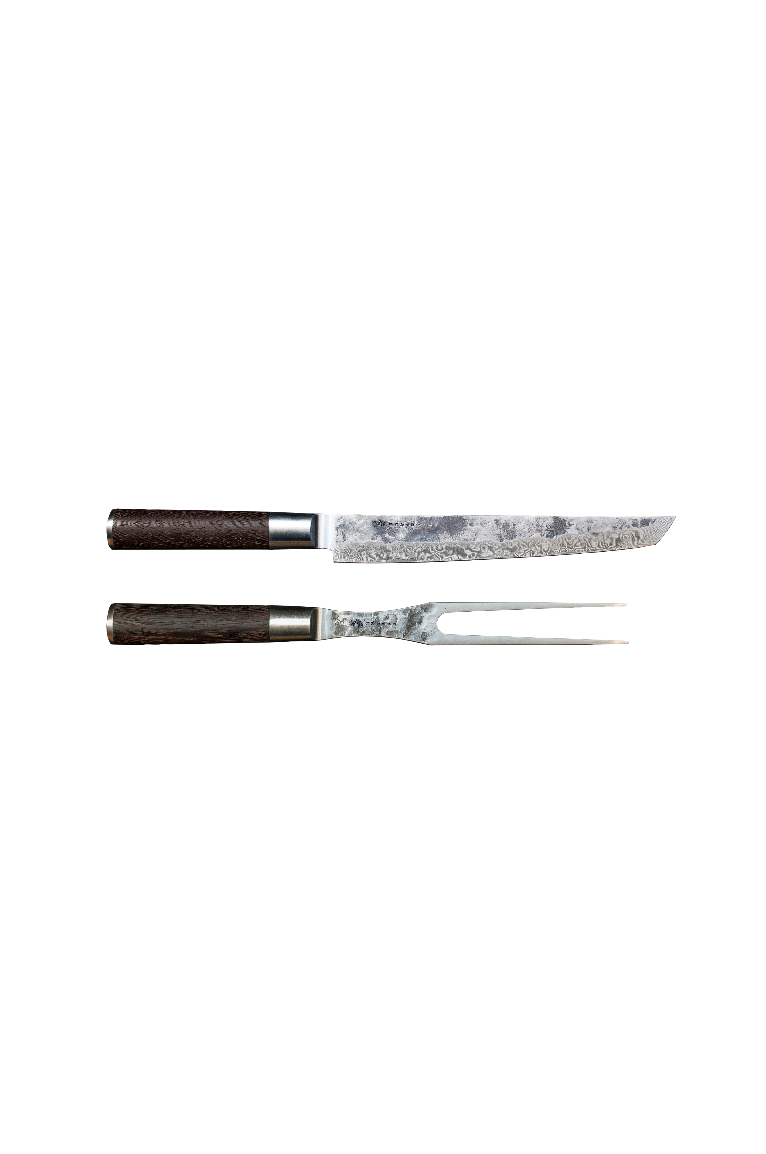 Kuro er en serie af groft hamrede knive. Et vg-10 stålblad, der er bearbejdet otte gange, hvilket giver den ekstra skarphed og en hårdhed på omkring 58 hrc. Det lange brændte træhåndtag med bolster og 18/8 stålskaft giver perfekt greb, balance og stabilitet. Dette sæt er et utrolig lækkert tranchérsæt til at kunne skære lange og fine snit i bøffen eller fisken.