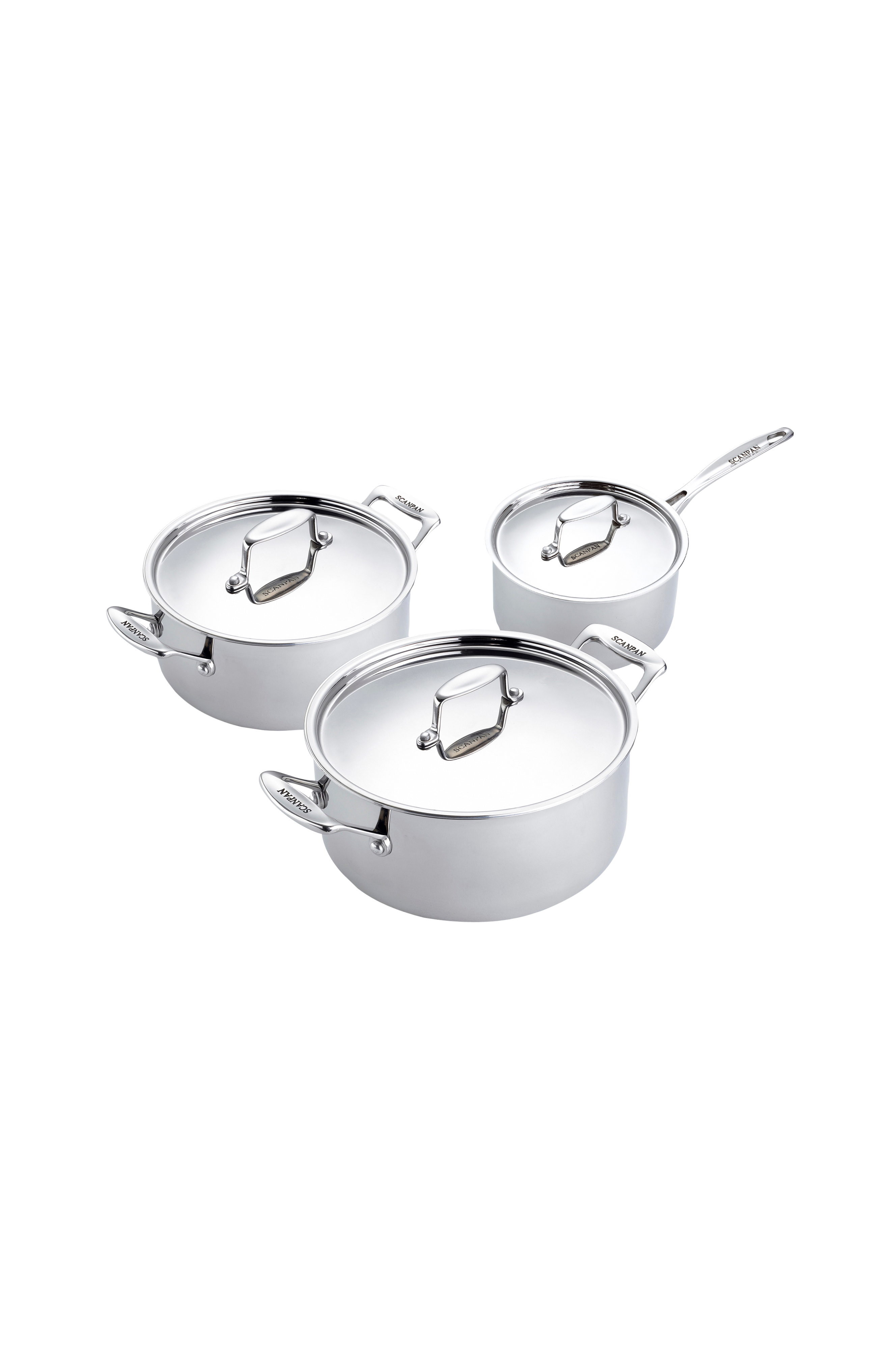 Et komplet grydesæt som består af en lille kasserolle, en basisgryde og en stor gryde. Låg i rustfrit stål medfølger.