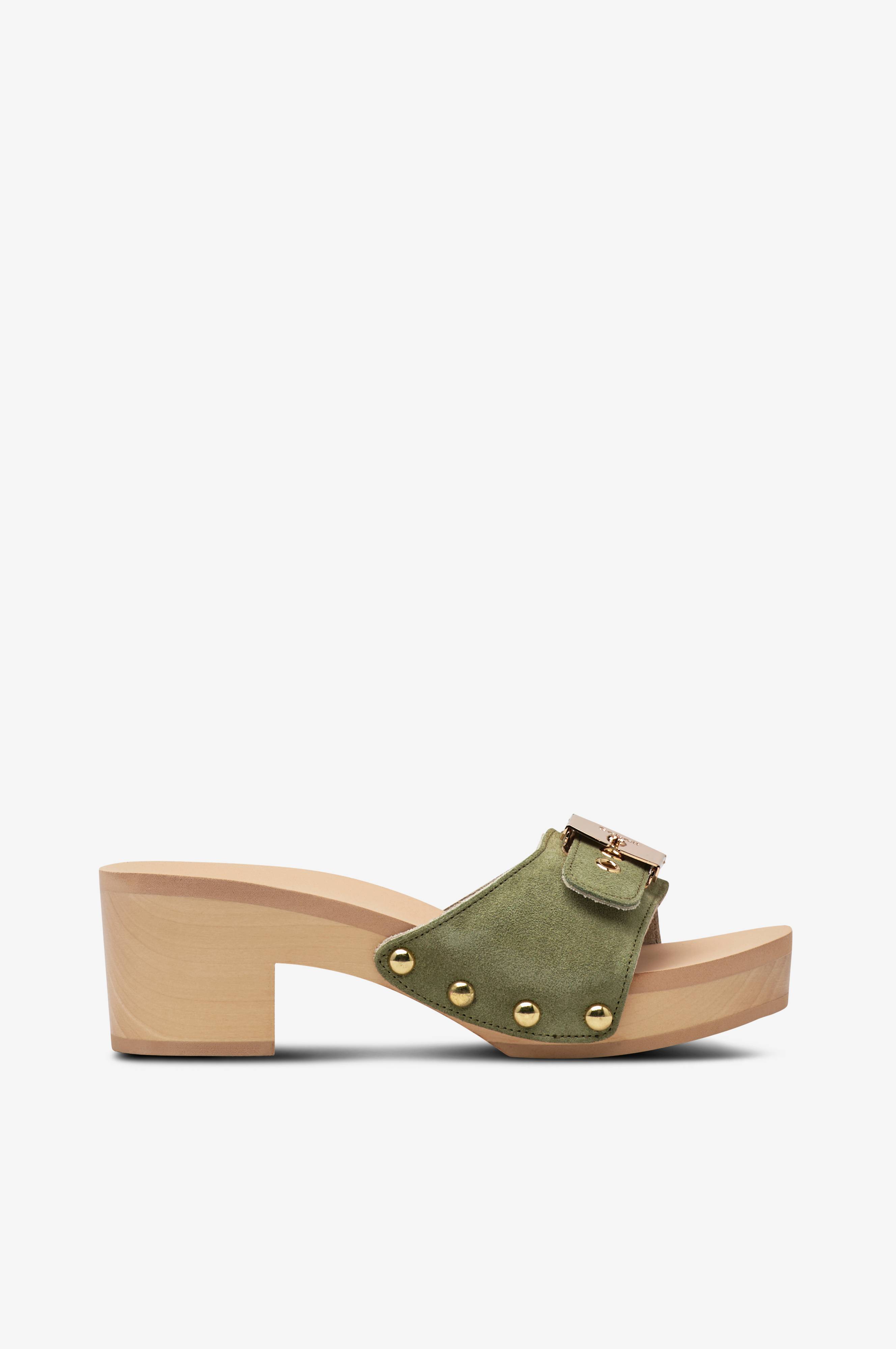 • Sandaler med hæl i træ med blokhæl• Justérbar rem i ruskind med metallukning• Fodseng i EVA• EVA ydersål• Hælhøjde: 6,5 cm