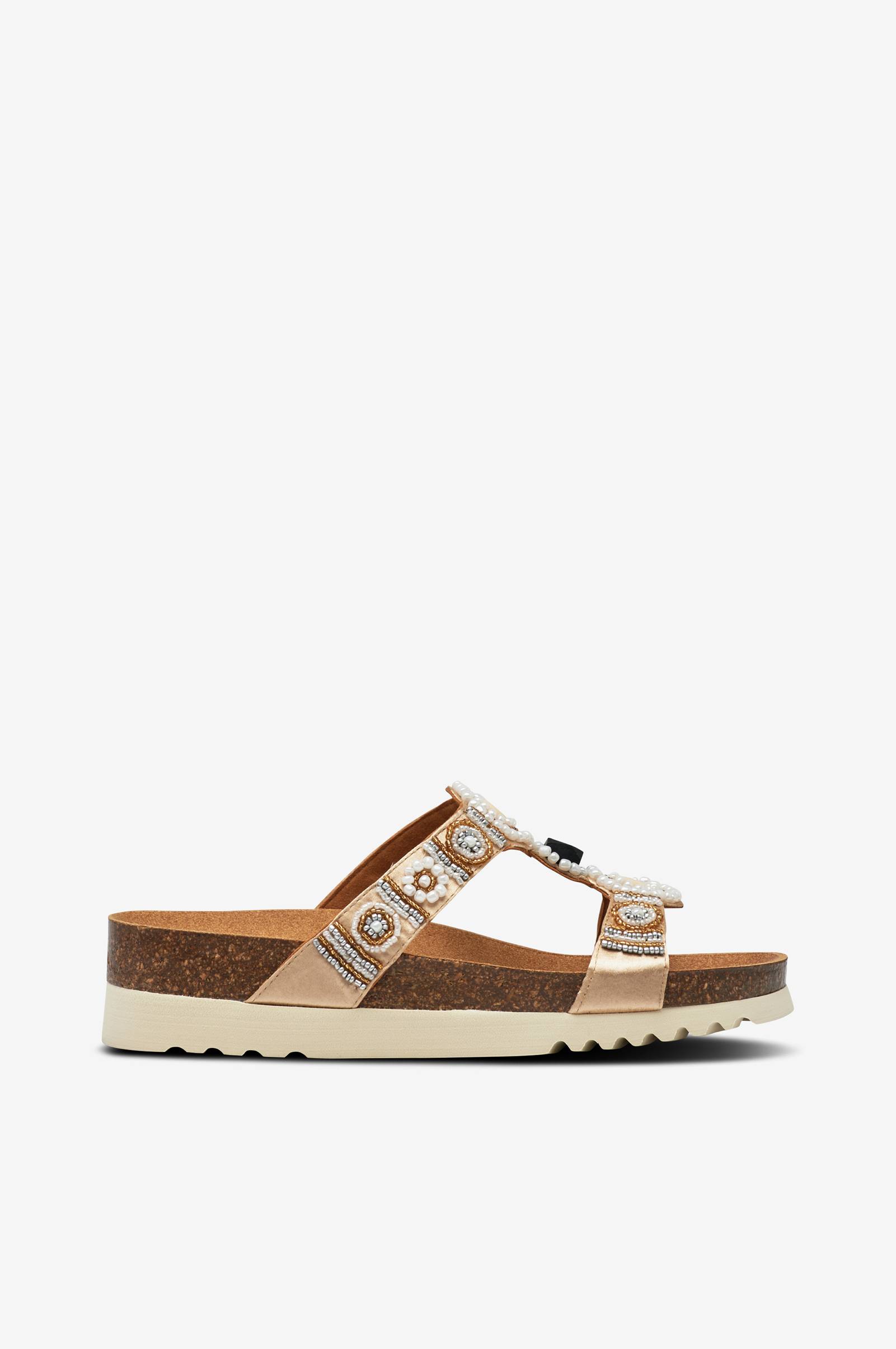 • Øvredel i tekstil med perler• Ydersål i EVA• Anatomisk fodseng af syntetisk kork fremstillet med Scholls unikke Bioprint-teknologi• Opbygget svangstøtte og anatomiske flexzoner• Sålhøjde: 4 cm