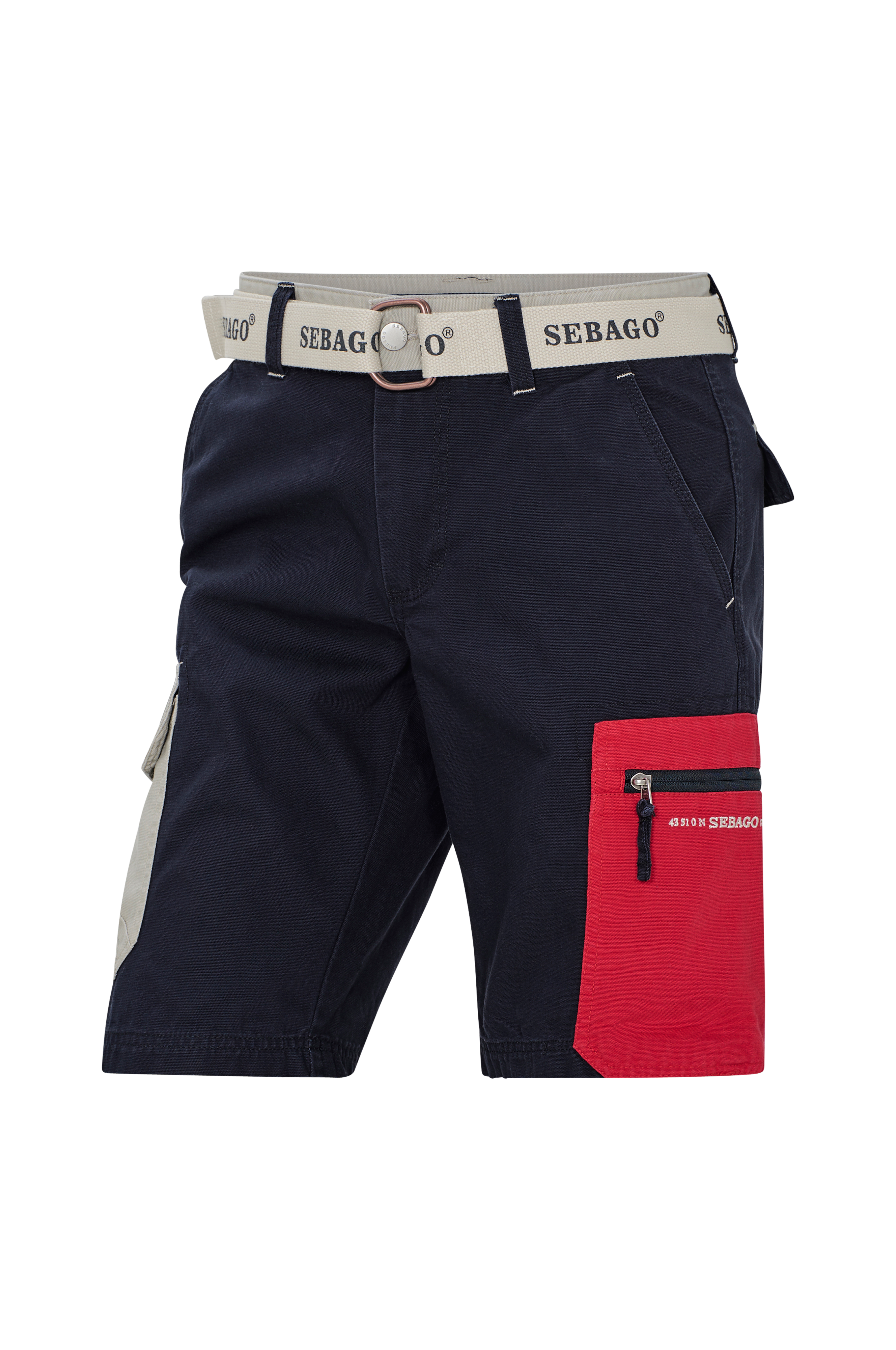 Cargoshorts Red Pocket Shorts fra Sebago i kraftig, vævet bomuldskvalitet. Linning med knap, bæltestropper og et vævet bælte med Sebago-print og metalspænde. Gylp med lynlås. Tre lommer foran, heraf en med lynlås. To baglommer med klap og trykknap. To benlommer, en med klap med knap og en med lynlås. Indvendig benlængde ca. 26 cm i str. M.