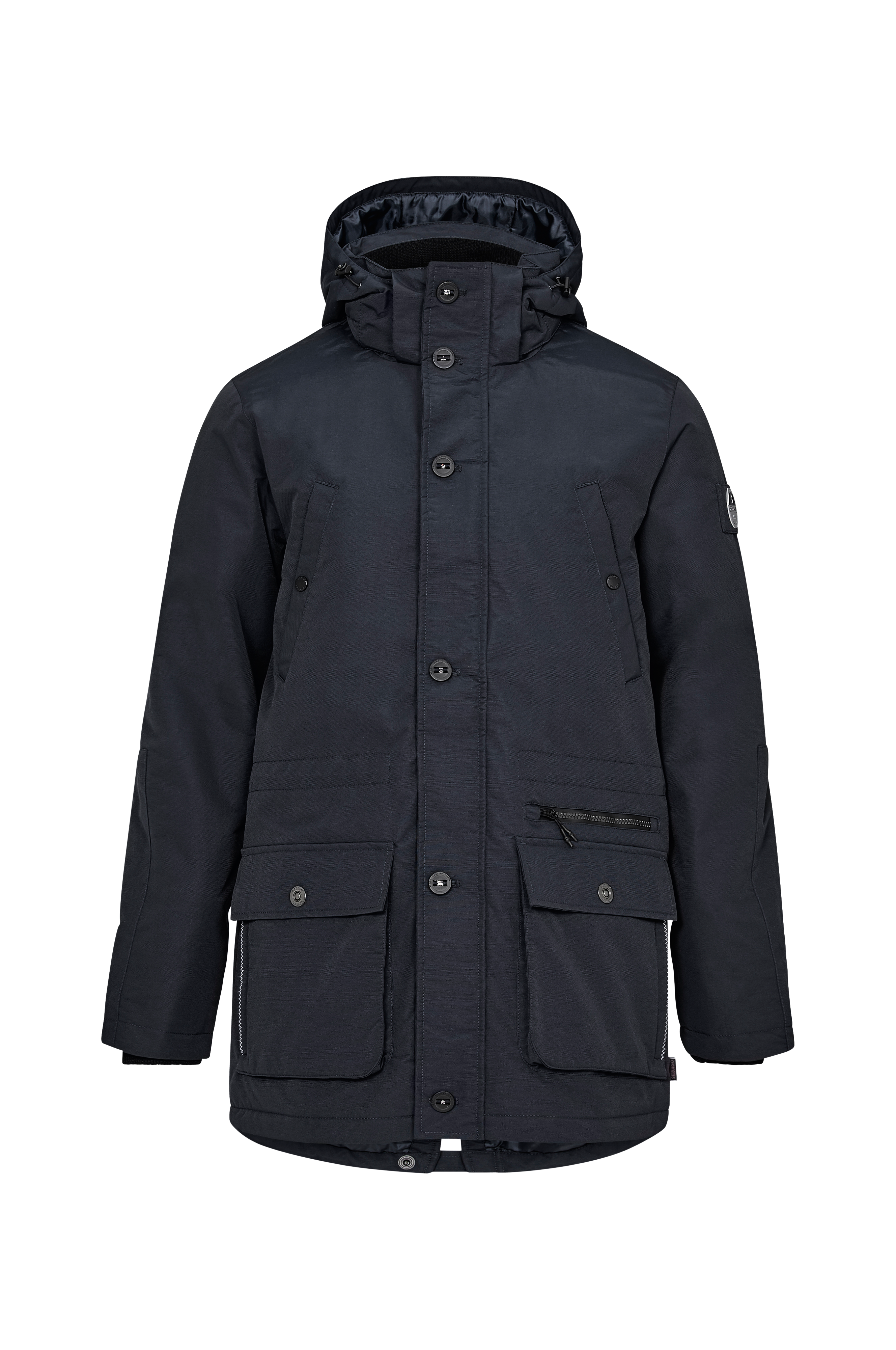 Parkacoat Port Parka fra Sebago i klassisk model. Den er vind- og vandtæt med åndbarhed og varmt vatteret. Alle sømme er tapede og vandtætte. Aftagelig hætte som har løbegang og stop. Høj krave med ribstrikket inderside. Lukning med 2-vejslynlås som har hagebeskytter og beskyttende overfald som lukkes med knapper. Indsat løbegang med stop i taljen. To lommer forneden med lommeklap med knap og to indstikslommer med lynlås med håndvarmerfor i fleece. To fleeceforede brystlommer med trykknap. To store inderlommer i mesh samt en inderlomme med lynlås. Ribstrikkede kanter i ærmekant. Slids forneden bagpå og reflekterende patch med Sebago-logo på venstre ærme. Længde ca. 90 cm i str. M.
