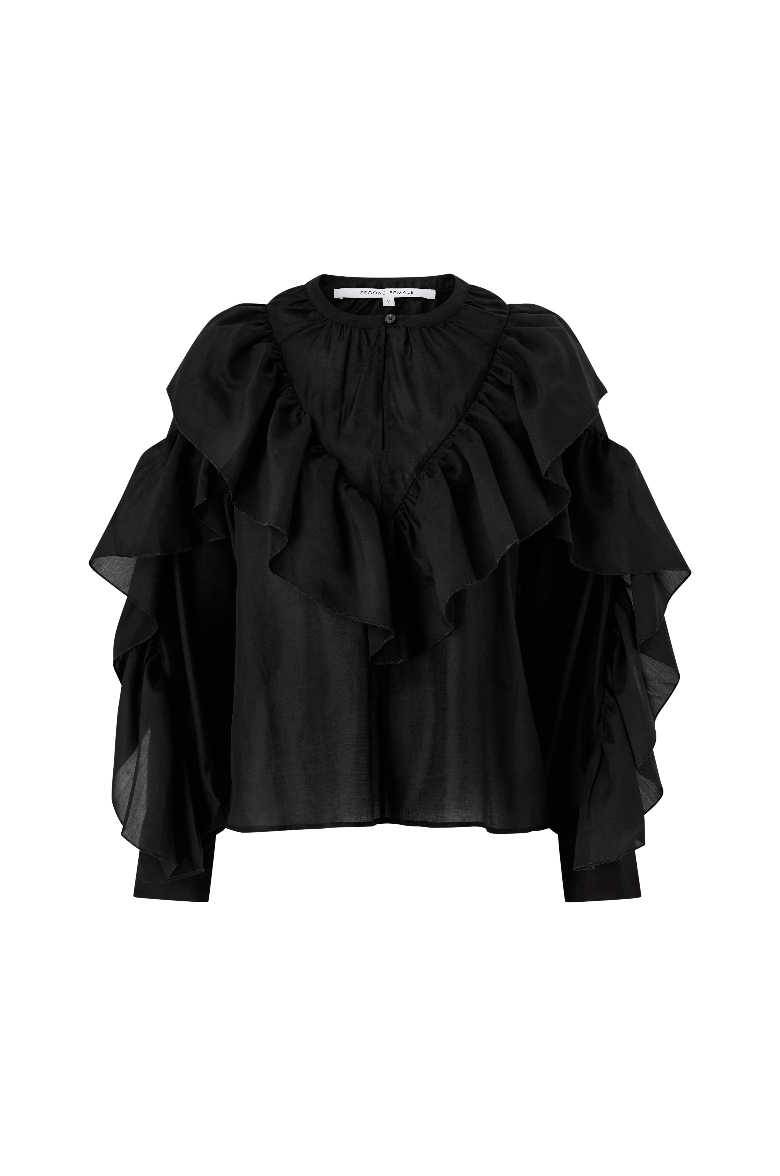 • Bluse med dekorative volanter• Rund halsudskæring• Slids med knap foran• Lange ærmer• Manchetter ved manchetterne• Afslappet pasform