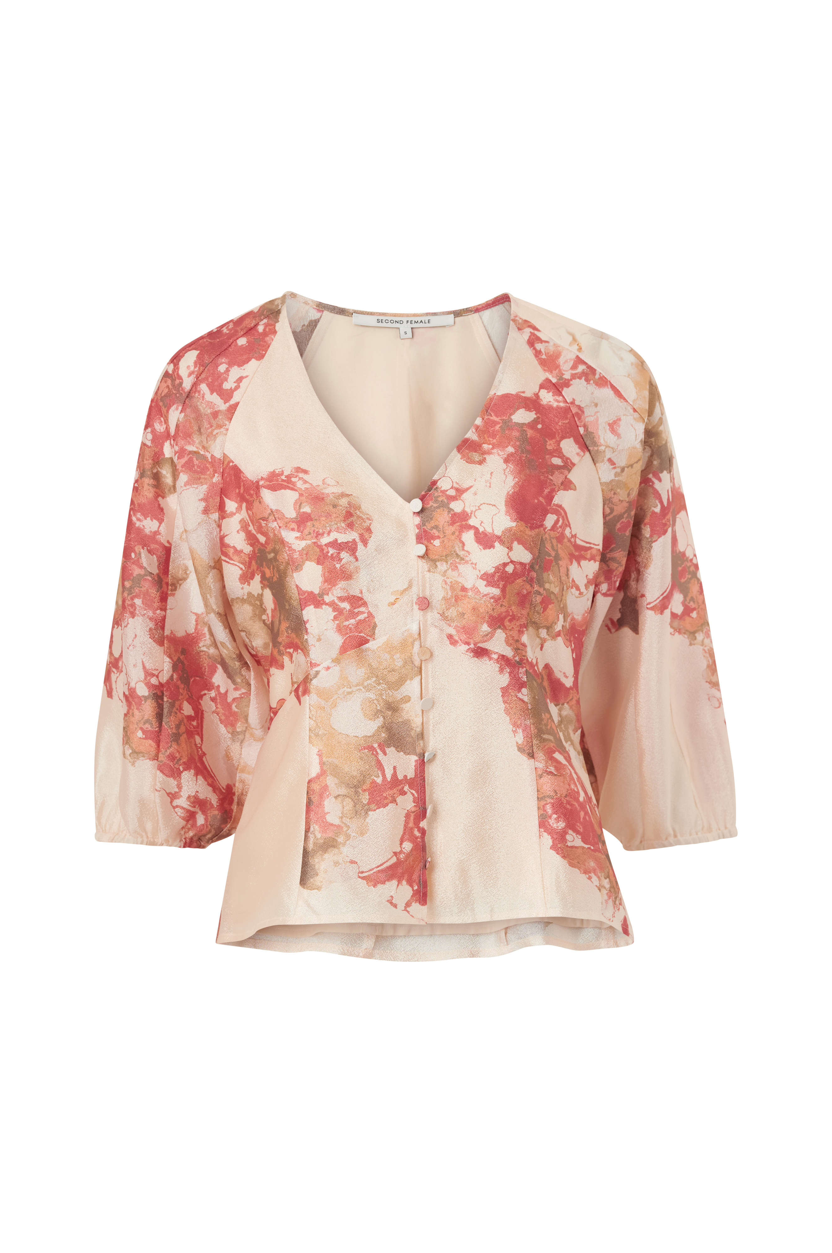 • Figurformede model i satin med glød• V-formet halsudskæring• Løkkelukning med beklædte knapper foran• 3/4 langt, raglan-skåret ærme med vertikale sømme og elastik ved manchetterne• Foret
