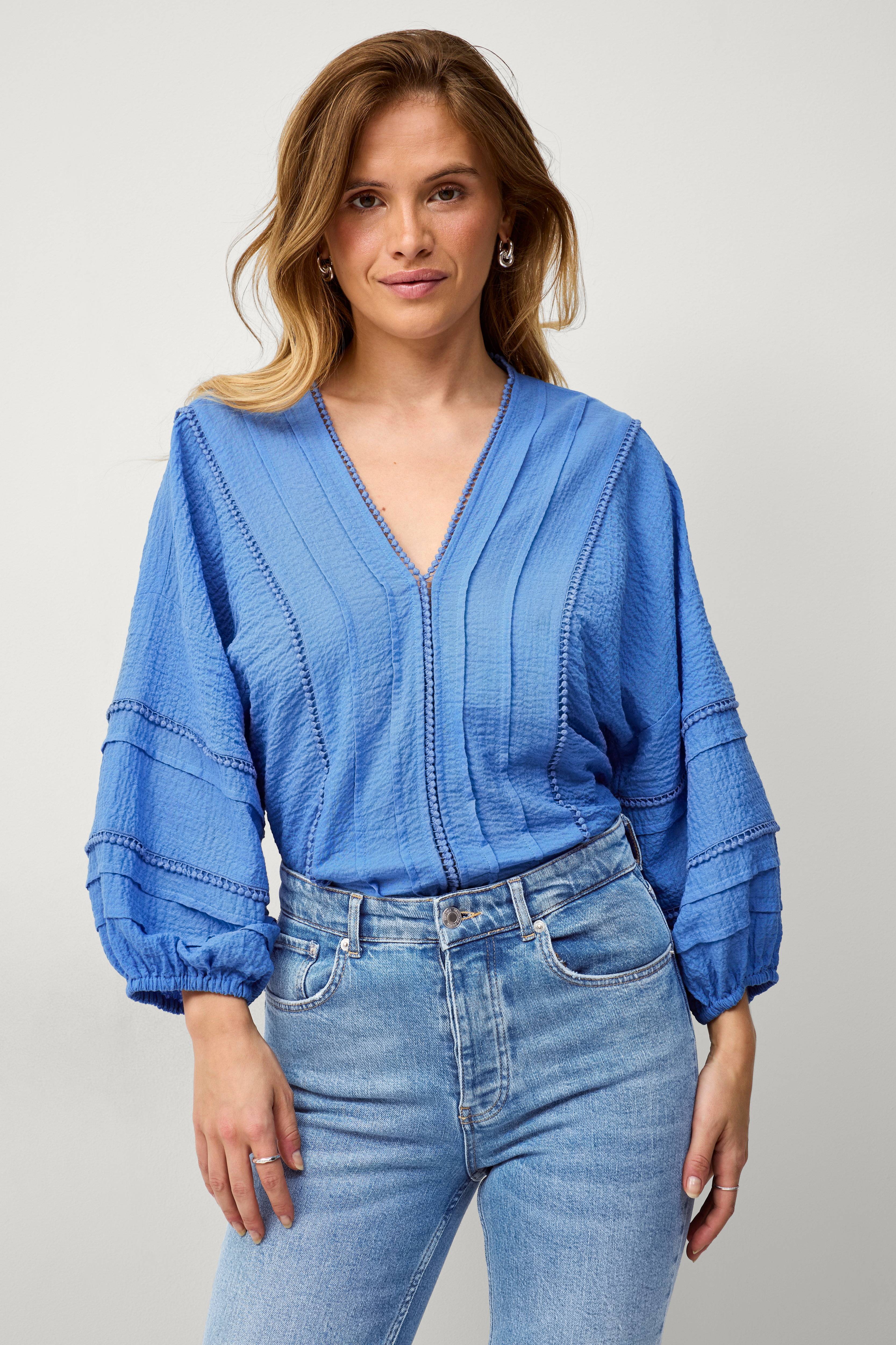 • Syede biselæg foran• Pompom-kant• V-udskæring• Ballonærmer