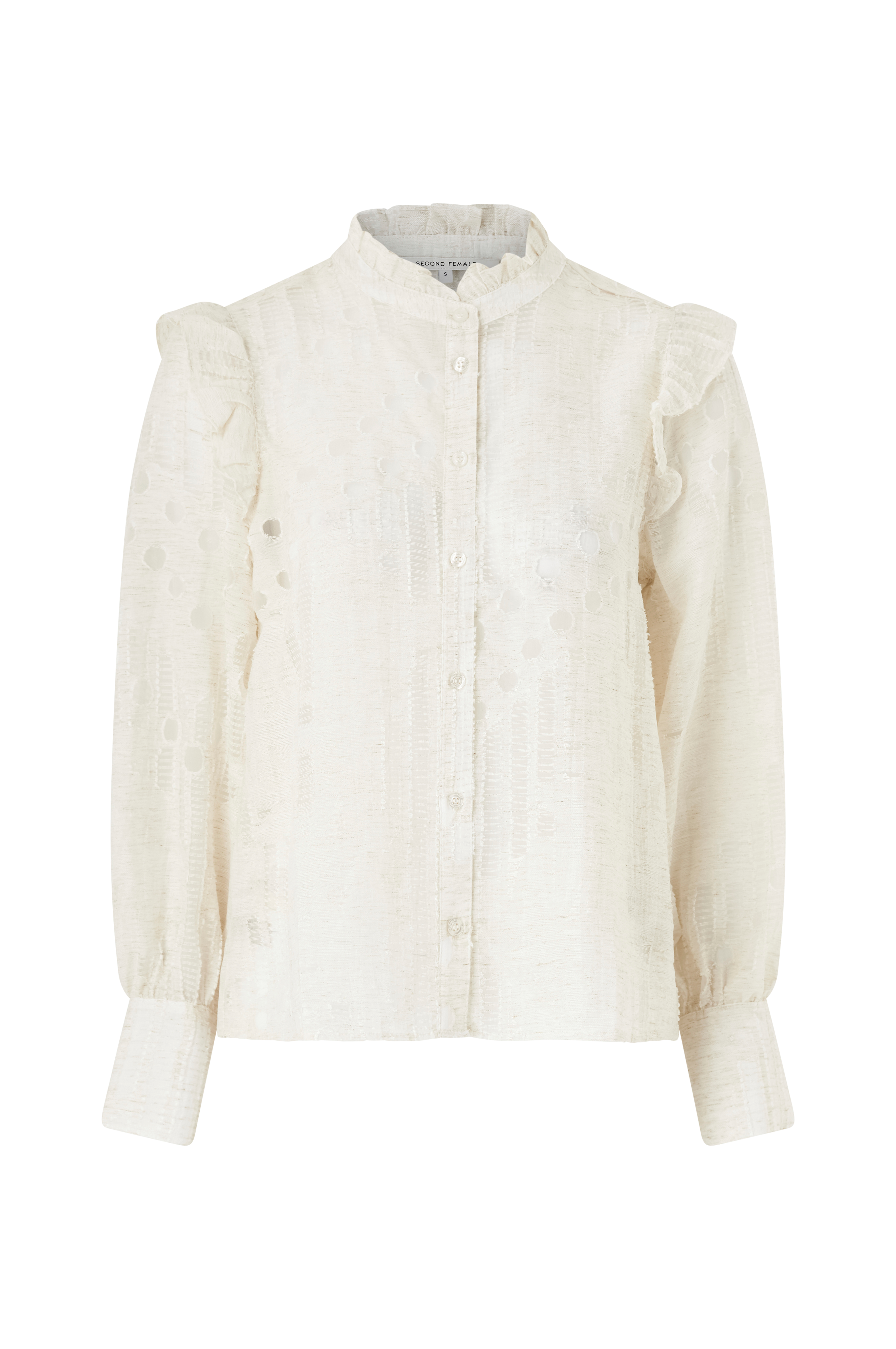 Denne bluse er lavet i en let viskoseblanding med halvgennemsigtig udbrændthedseffekt. Den har en høj krave med flæsekant og gennemgående knaplukning foran. Flæse ved skuldersømmen og lange ærmer med knaplukning. Lige kant forneden. Løs og lige pasform.