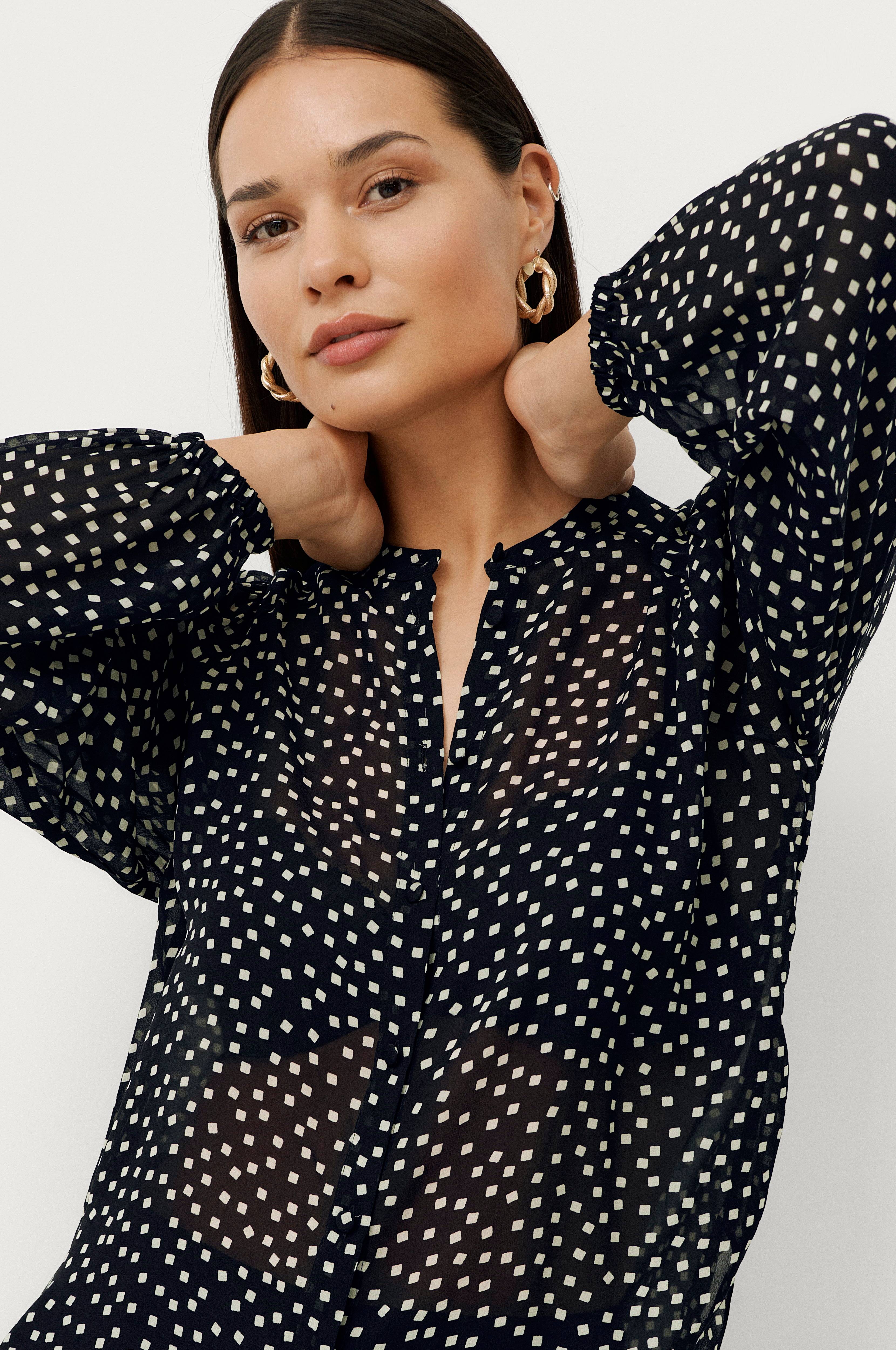 • Transparent bluse i chiffon• Knapper foran• Ballonærmer med elastiske manchetter